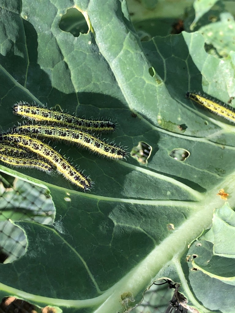 The cabbage white butterflies have laid their eggs on the previously healthy Brussels sprouts plants. The eggs became caterpillars and they have munched (and continue to munch) through the Brussels plants – decimating them