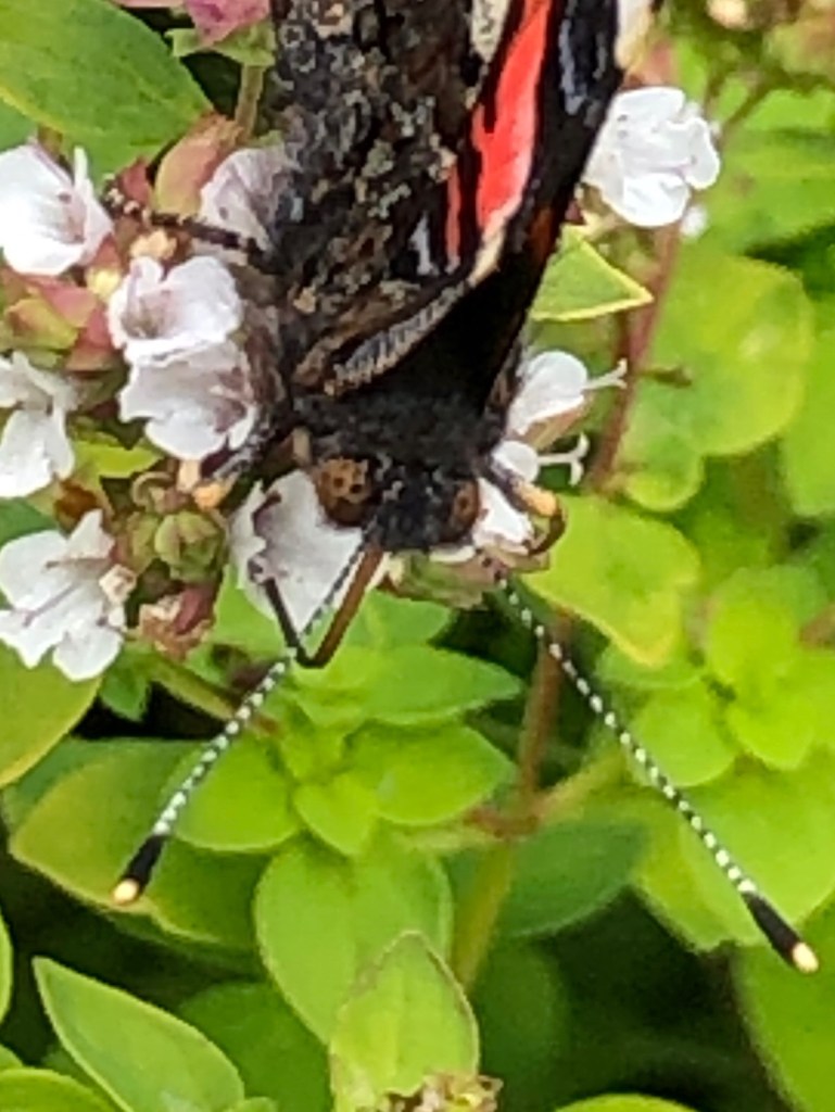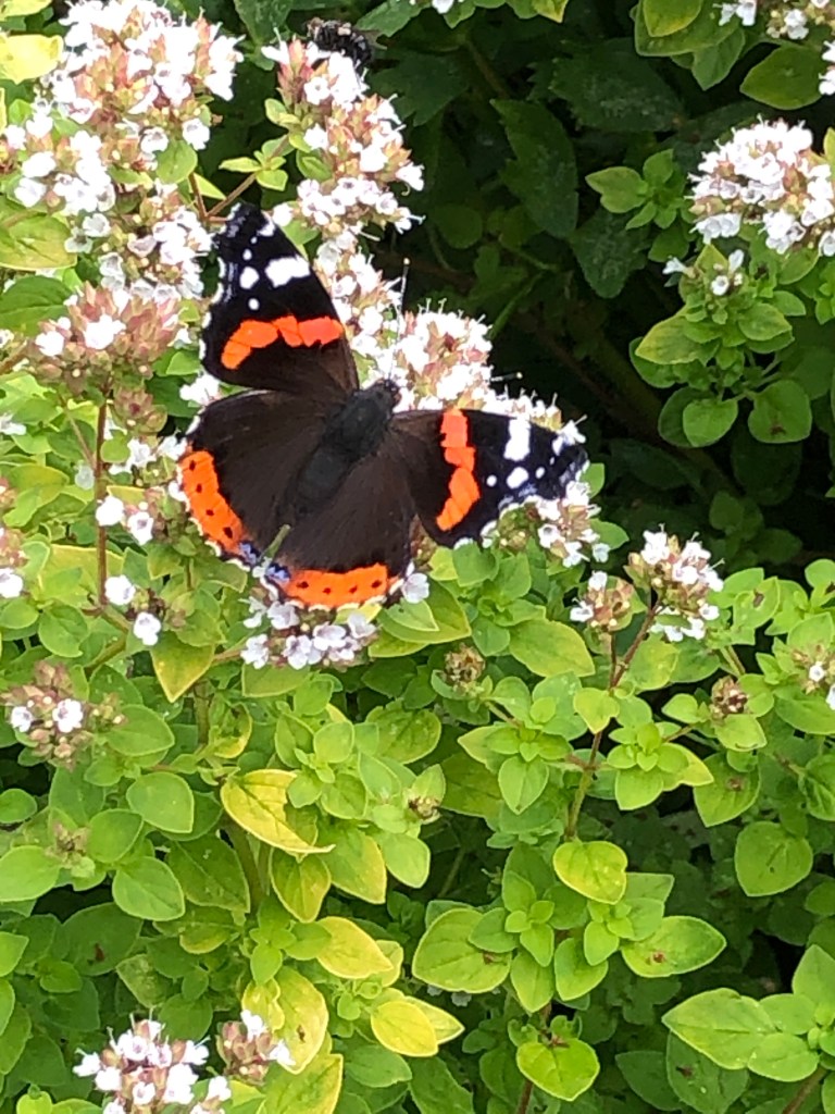 Nature is a balm to the soul. A Red Admiral sits on the flowers of the oregano plants