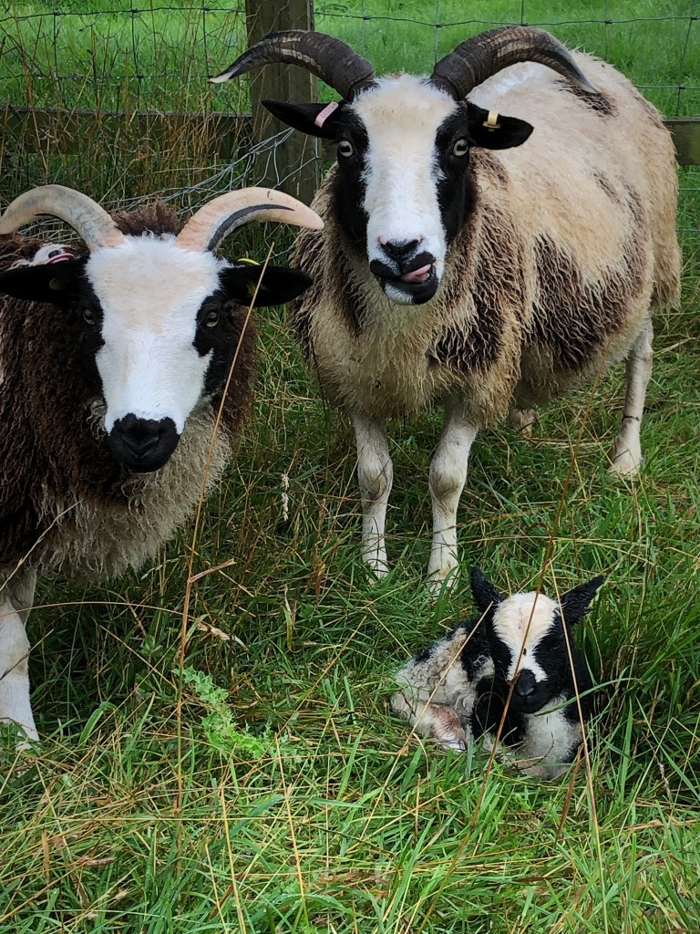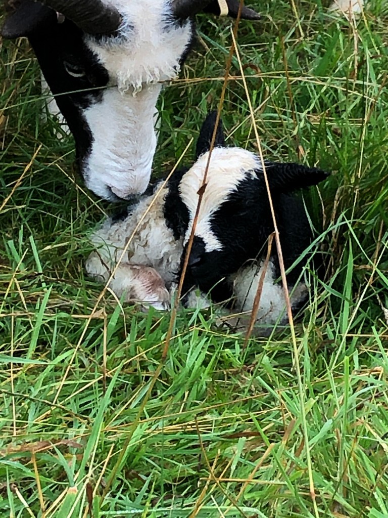 Six month old Susie comes over to admire and protect her mum’s new baby lamb