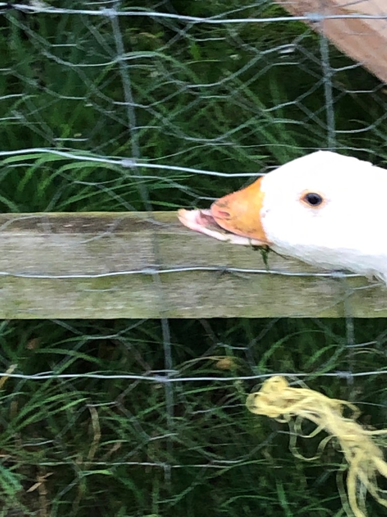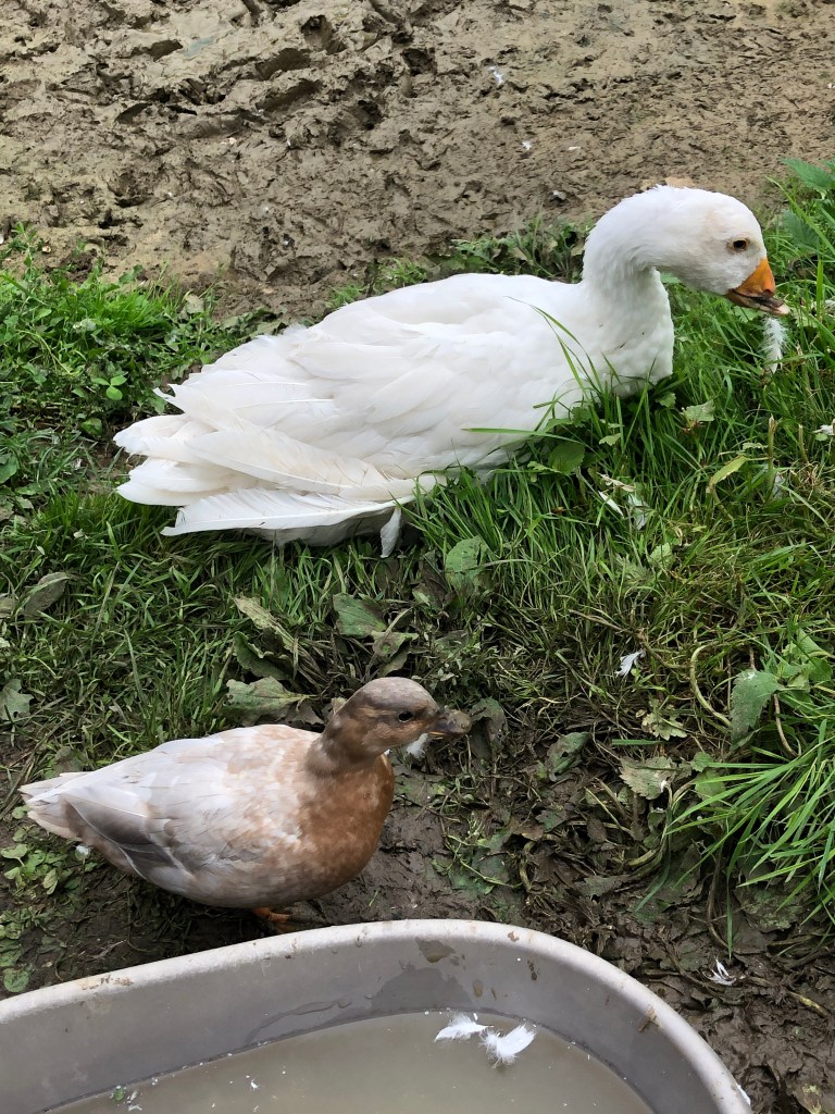 Some time ago our friends in Bedford offered to use their new incubator to hatch some Call Duck eggs for us. We sent away for a batch of fertile eggs but only one hatched, Lola. They also put a goose egg under one of their broody hens. As the gosling began to hatch their hen took fright and pecked at the beak of the emerging bird. The result was a deformed bird who was, none the less able to feed and grow. The family named her Lucy. The gosling and the duckling grew up together and became inseparable and very tame.