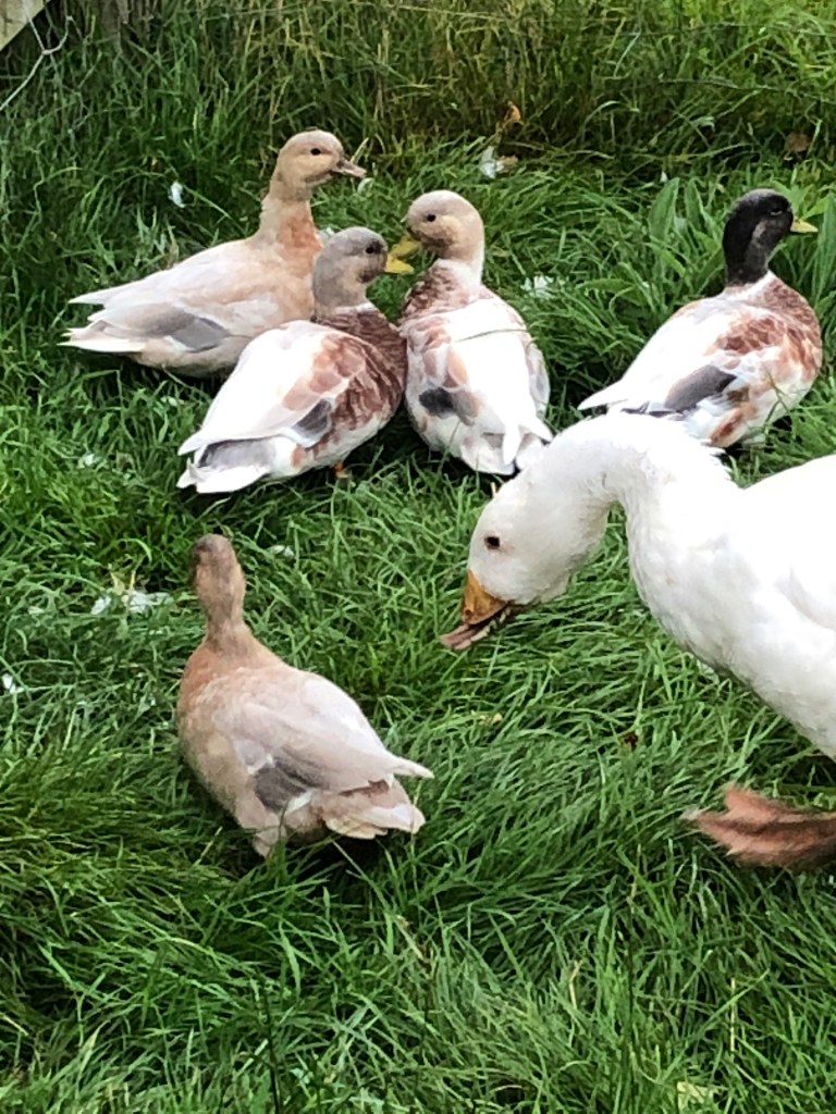 Our four existing Call ducks are not quite sure what to make of this strange pair. Luckily there are two houses in the duck run. One for the existing flock and one for Lucy and Lola.