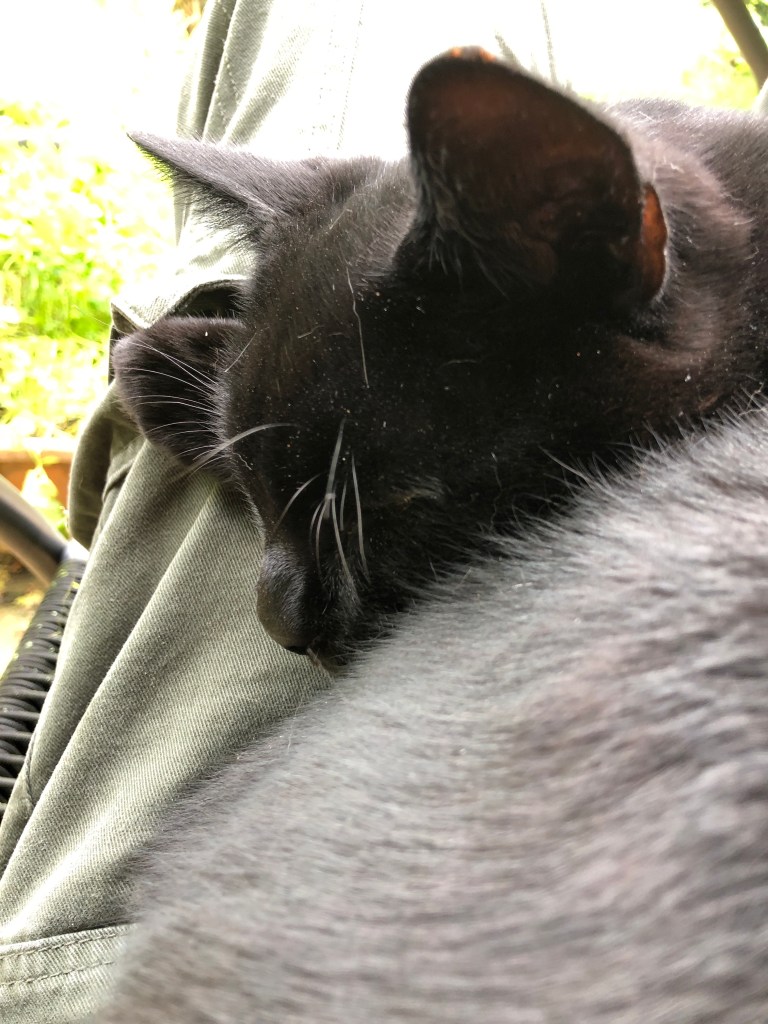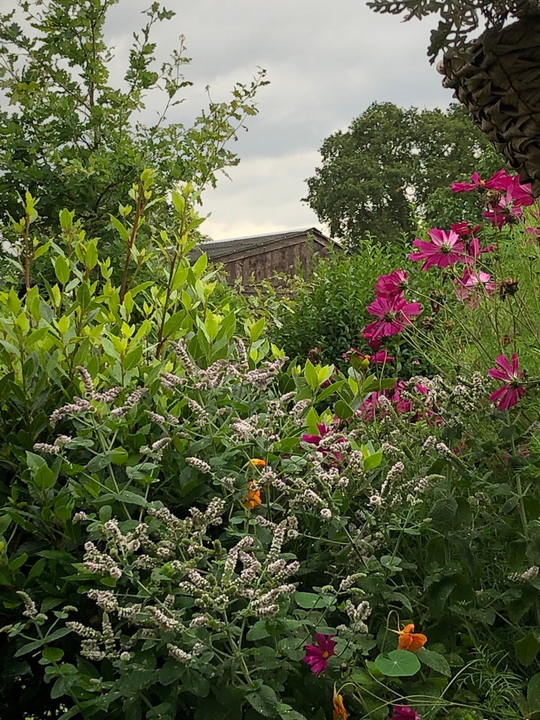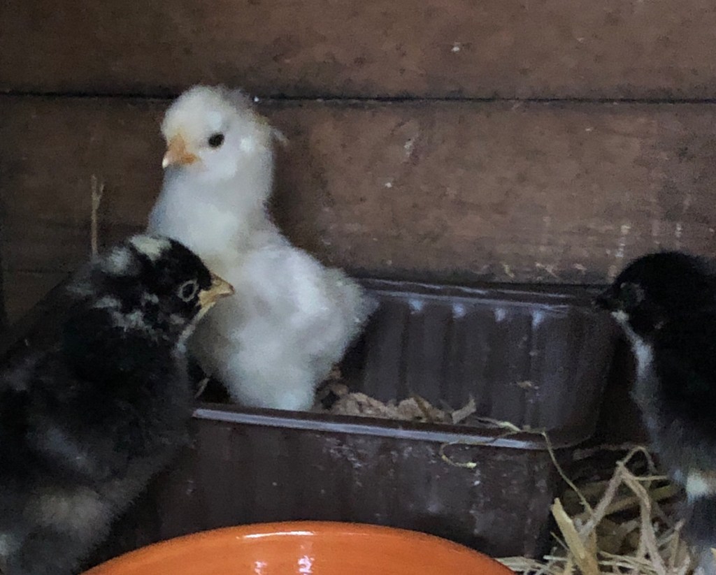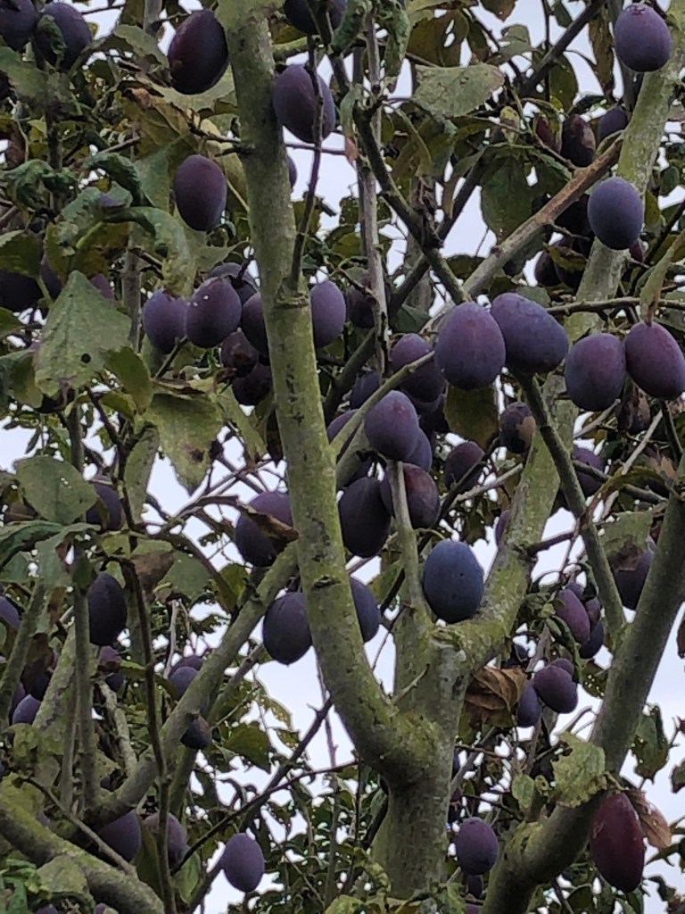 The grey hen is one of the “odd couple”! I can’t resist her so I’ve just given her 8 eggs to incubate underneath her warm feathers The three newly hatched chicks are thriving Bobo (Boaz) and Surprise are good friends One of the plum trees we planted 7 years ago is dripping with purple plums. A friend took plums home on Wednesday night. She just sent me this photograph Flowering mint and cosmos flowers Nigel on my lap as I sit and blog