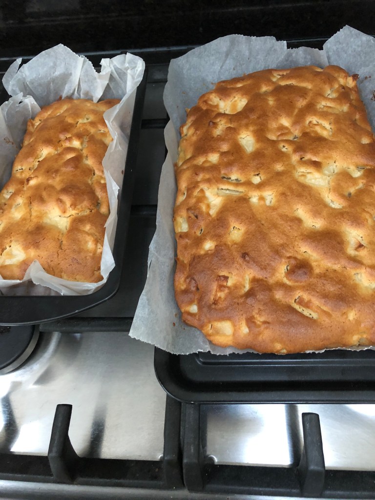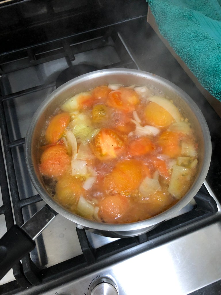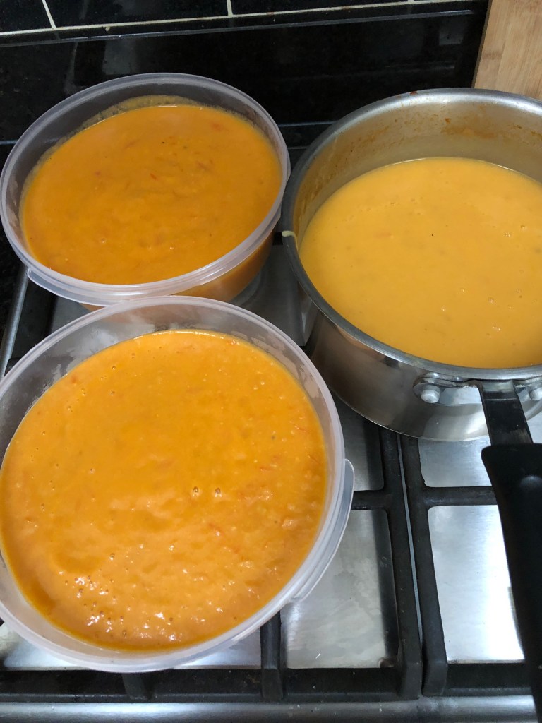 Garden tomatoes and onions made into pasta sauceGarden tomatoes, onions and potatoes cooked into a tomato soupPasta sauce (2) and soup (1) after blending with a hand stick blender Windfall apples chopped and baked into 2 apple cakes