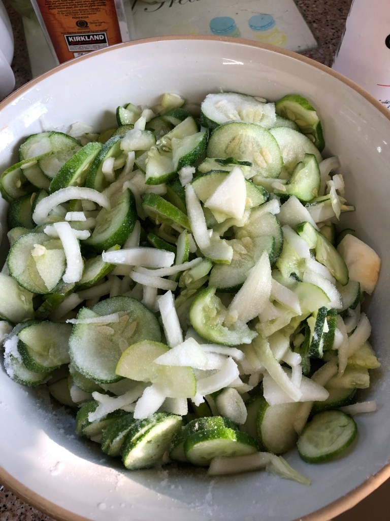 Thinly slice cucumbers and onions and leave in a bowl with salt for at least 8 hours