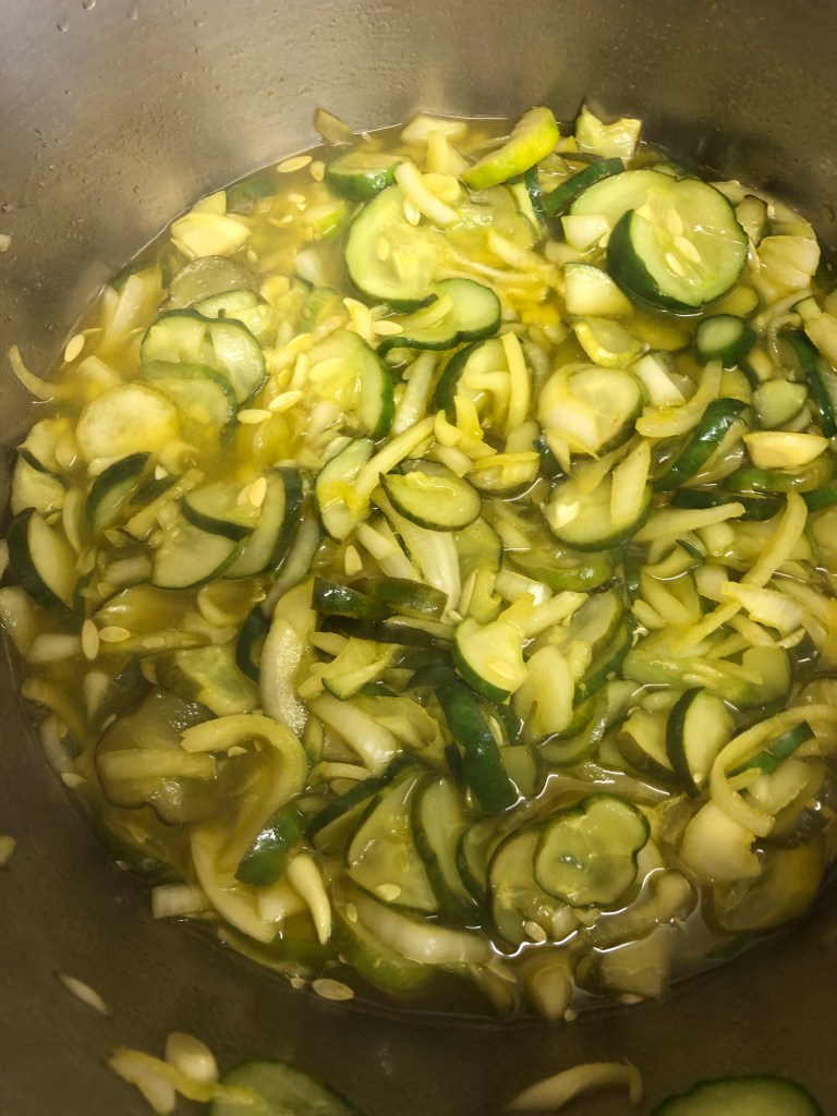 Drain off the water and place in a simmering mix of vinegar, sugar, turmeric and mustardUsing slotted spoon add vegetables to sterilised jars then add liquid to the top and close tightLabel and store in the pantry or on the shelf