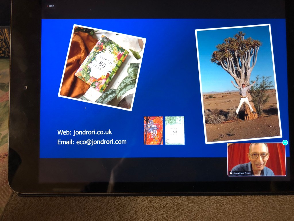 September 26, 2021 by gfreedman2013 I’ve just listened to a fascinating zoom talk by Jonathan Drori Author of Around the World in 80 Trees and, his latest book, Around the World in 80 Plants. He is also a trustee of the Eden Project, an ambassador for WWF and a former documentary filmmaker for the BBC. Share this: Share on X (Opens in new window) X Share on Facebook (Opens in new window) Facebook Like Loading... Related