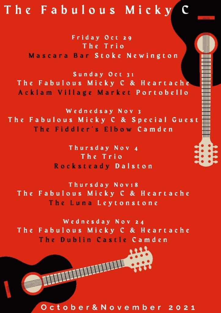 October 15, 2021 by gfreedman2013 I asked my brother, just now, about his next gig. He sent me this……. I think this is a tour!!!!!! Well if Coldplay can go on a world tour then my brother can tour North and East London! I’m too far away to get to the gigs and will stick to milking goats and admiring the autumn colours along Mill Road. Share this: Share on X (Opens in new window) X Share on Facebook (Opens in new window) Facebook Like Loading... Related