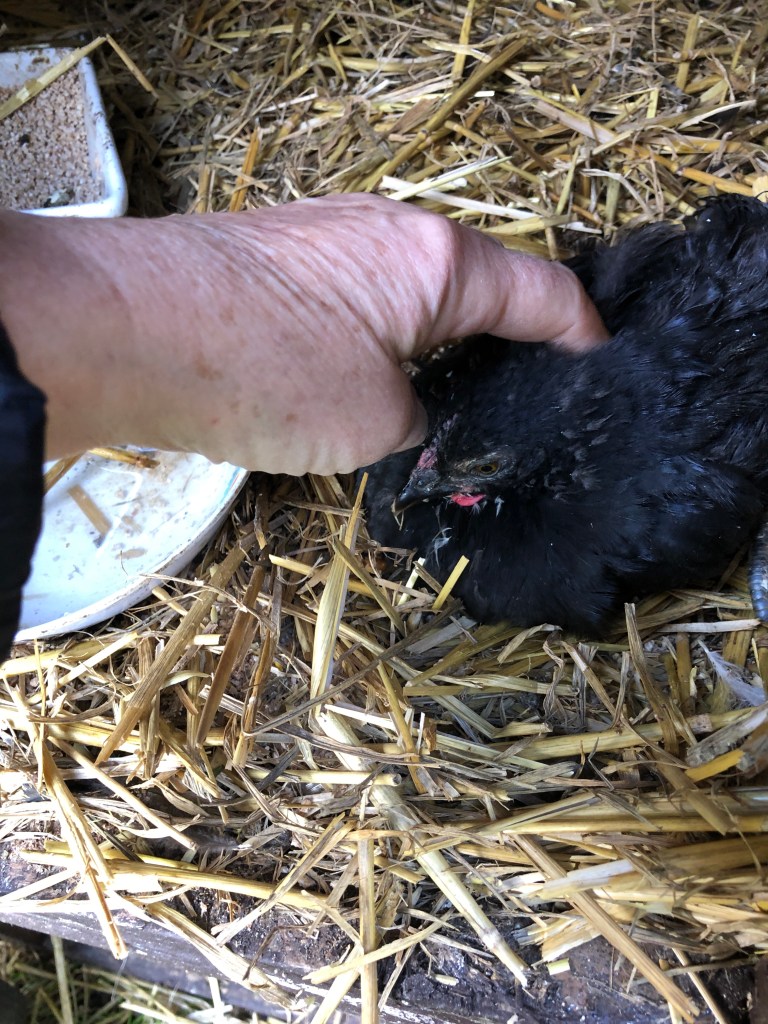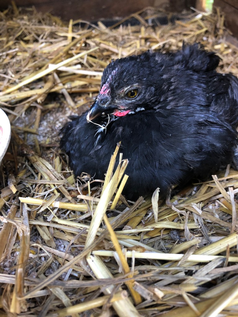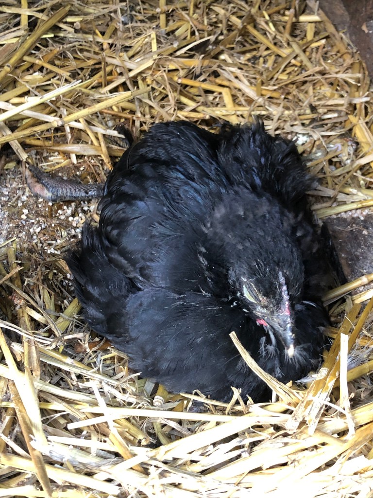 She wants to live! I will continue to give her food and water (she needs help to drink as she can’t stand) and she will get visits during the day and the company of mother hen and the other two chicks through the night.