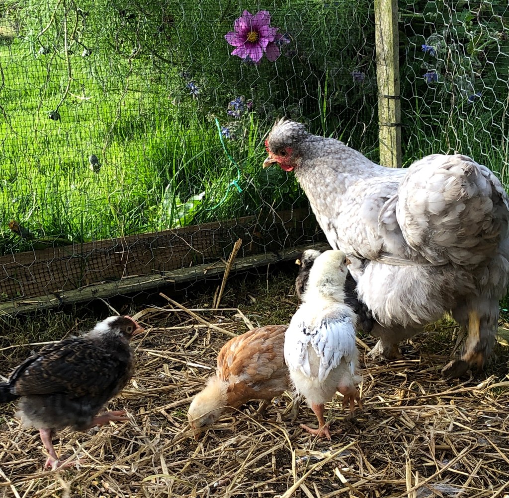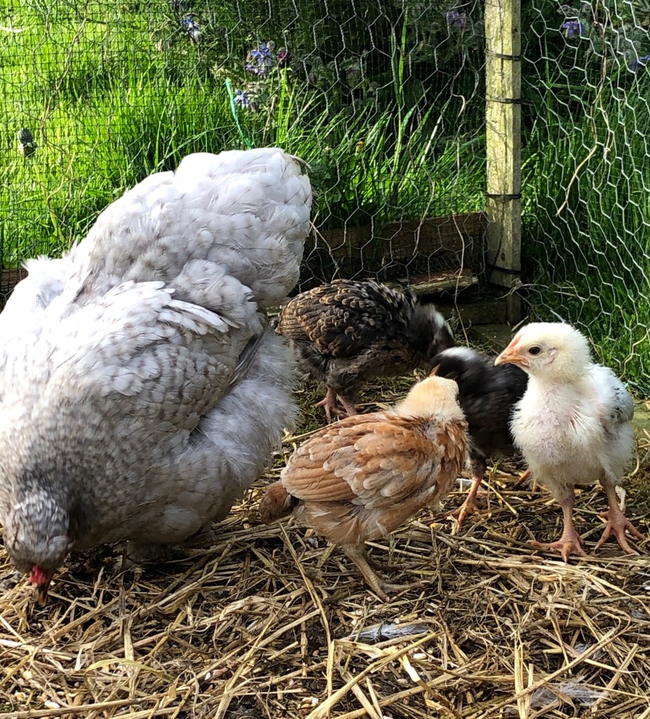 Grey Mother hen and her four chicks are living in a “nursery” run beside the pergola. They are doing brilliantly.