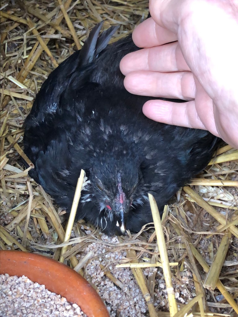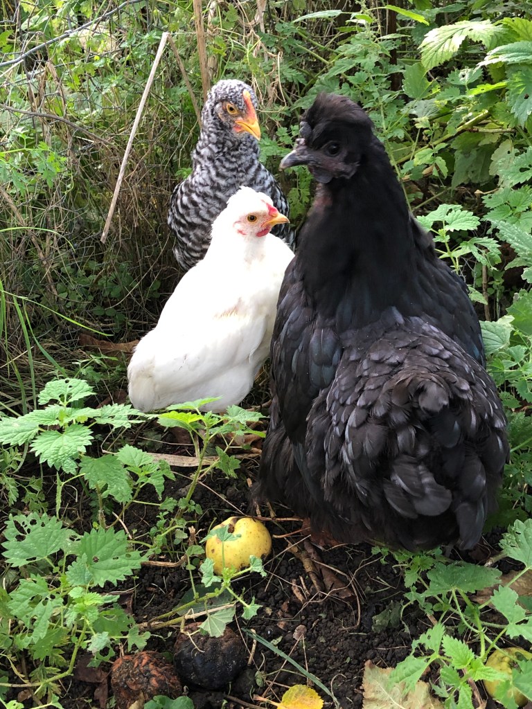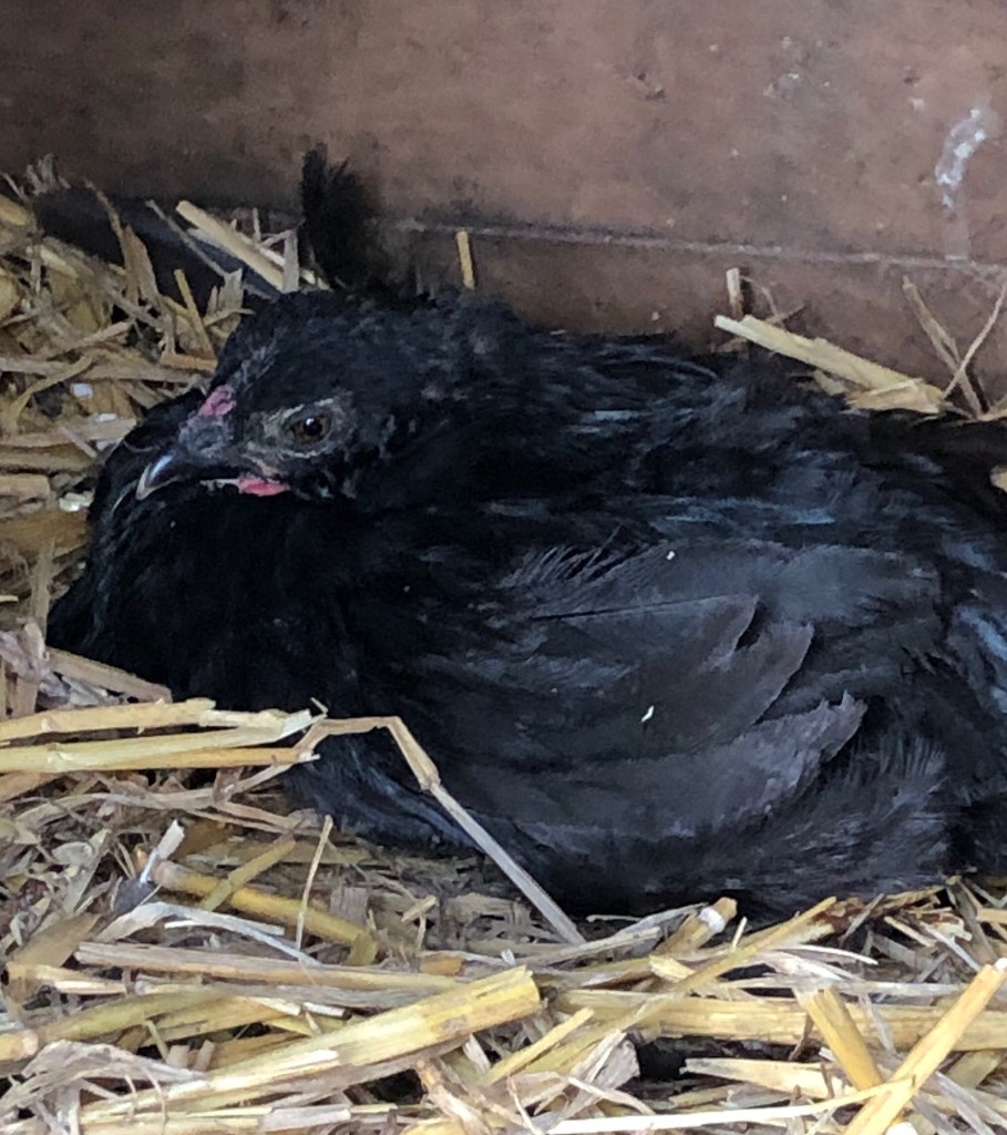 The Black Hen mother and her two able bodied chicks are further away from the house, next to the main chicken run. We think the white chick is a girl and the Maran type is a boy.