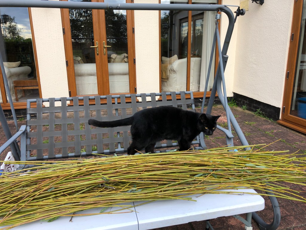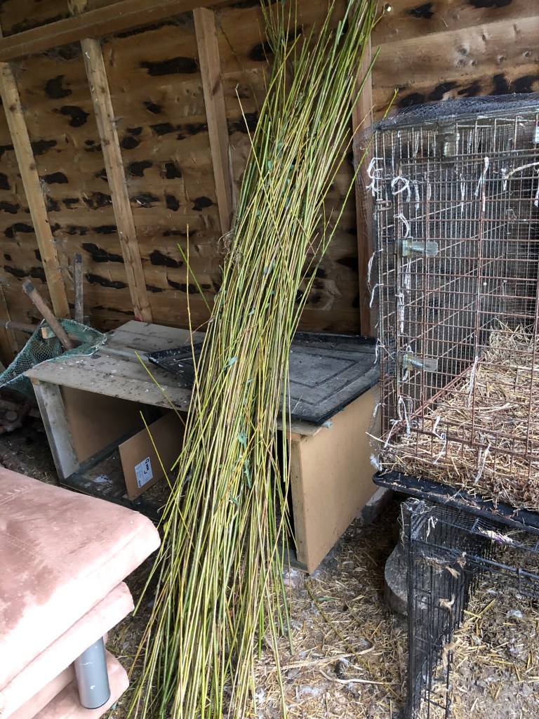 Then pick up the willow rods (now stripped of their leaves)And gather them together in a pileStack them in a barn and wait until the green willow dries out and turns brown. This can take several months – to be continued next year………