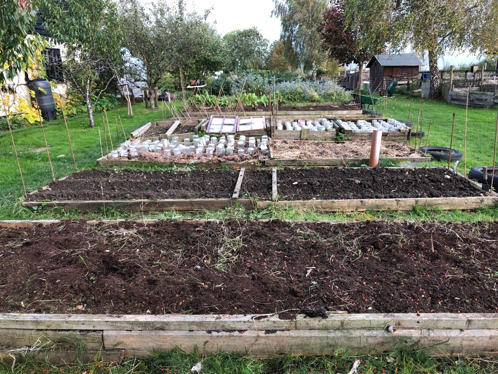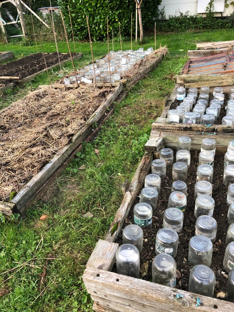 And broad beans and planted garlic and shallots and onions. The glass jars stop the pigeons from pulling out the garlics and onions until the bulbs are firmly established in the soil