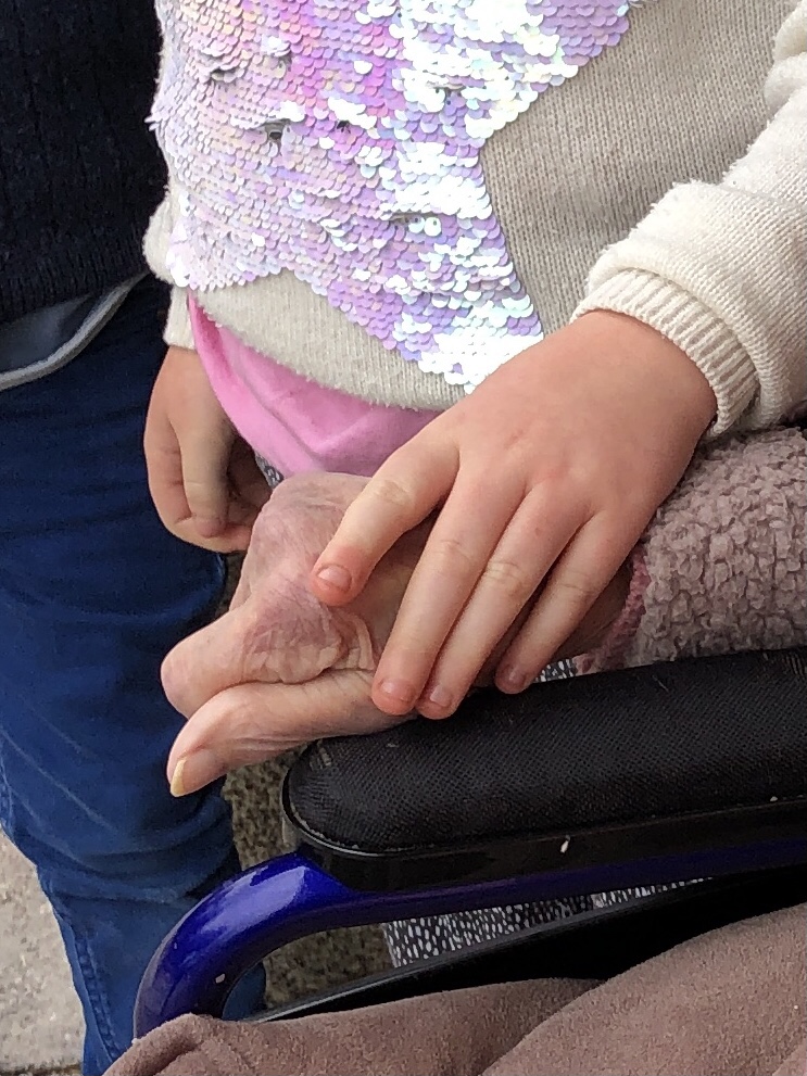 Whilst one half of the family were staying at The Gables with their friends (relaxing and also taking turns driving the tractor and helping Jeremy muck out the goat shed) I went to London. First I made a condolence visit to a family of whom we are very fond. It was good to reminisce and talk about a special lady. Then I went to see mum for a second time this week. I spoke with The Home and I was permitted to take a well wrapped up mother out into the courtyard where she saw two of her great grandchildren in person. She had seen them through a window during the first lockdown but holding hands was lovely.