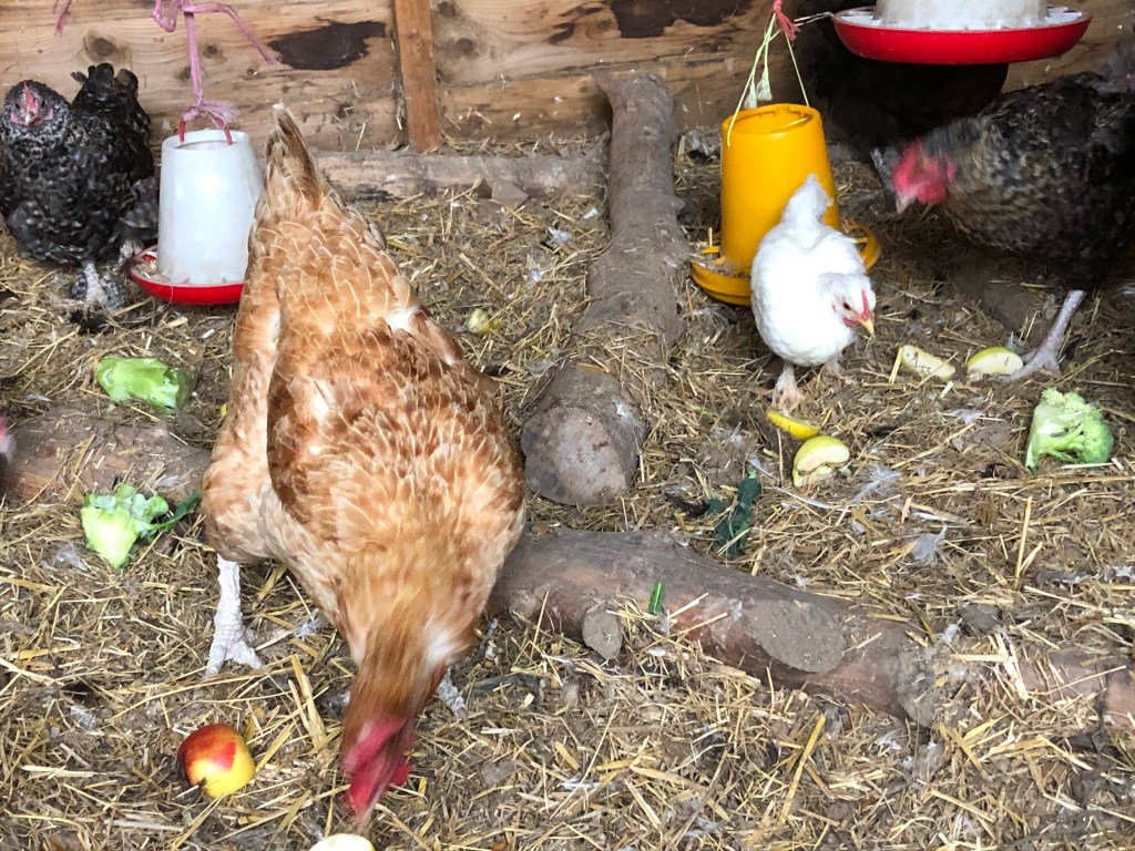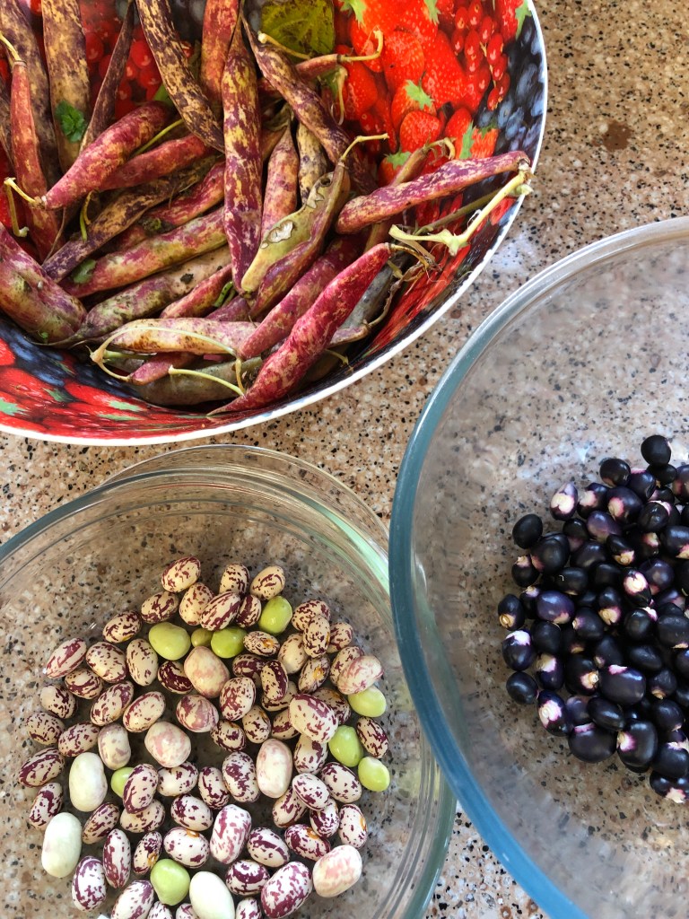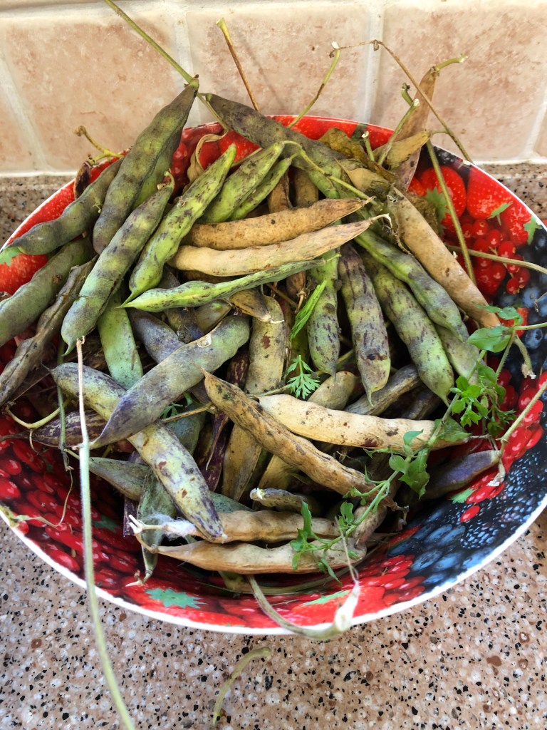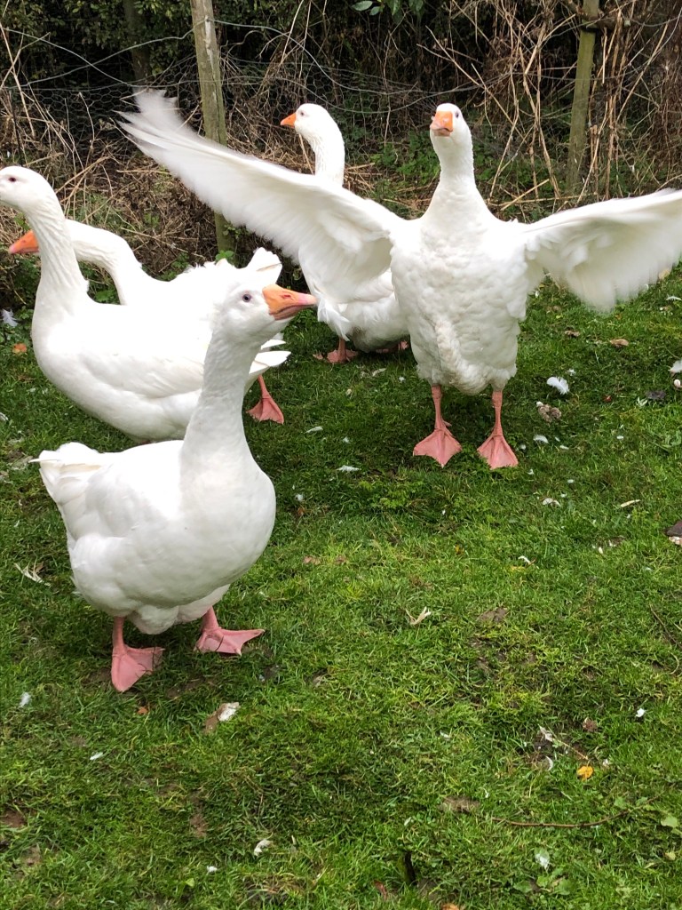 Here at home the geese are noisy and hungry They don’t realise that attacking me is not the best way to get fed!In the garden we picked the last of the borlotti beans and some french beans that have purple beans inside their pods. I will be making a bean casserole tomorrow The barn birds got a treat of cut up apples and greens. Perhaps they would lay me some eggs. I only got one today but that beats yesterday!
