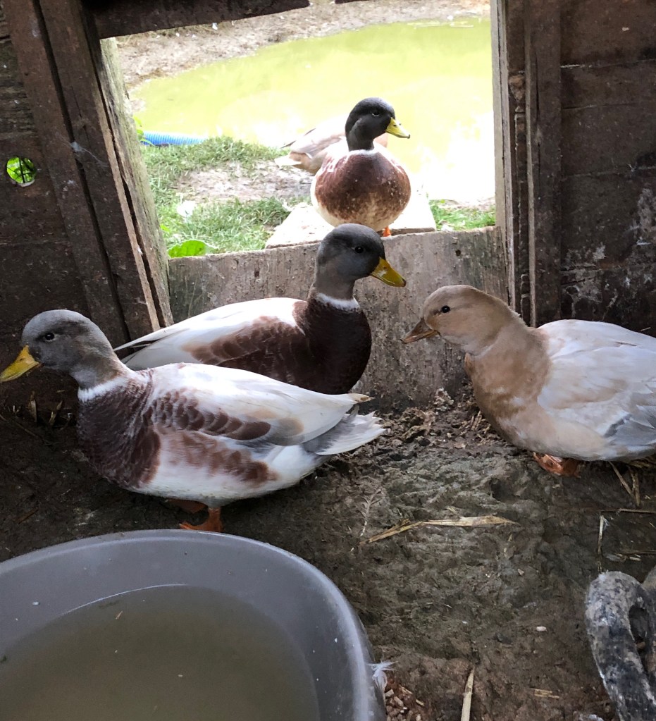 In the duck house the “gang of four” got indoors before Lucy the goose and her companion Lola. They ate their supper before the goose went inside and pushed them out of the way. She’s a hungry goose.