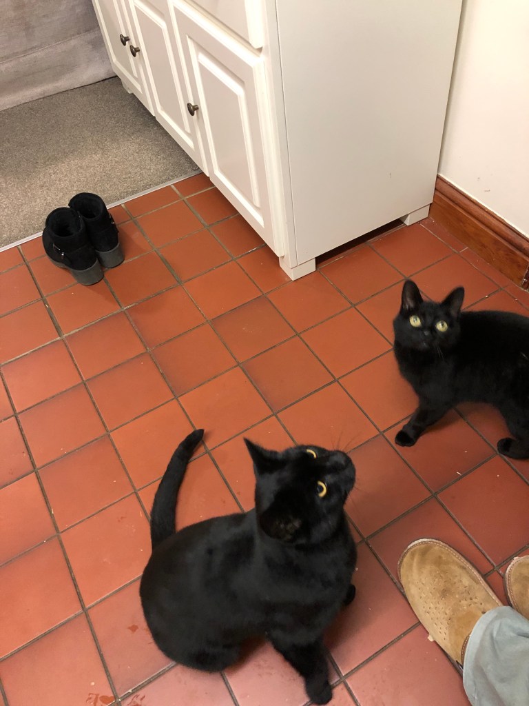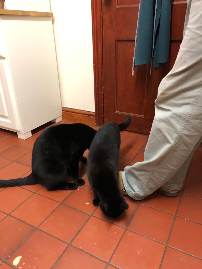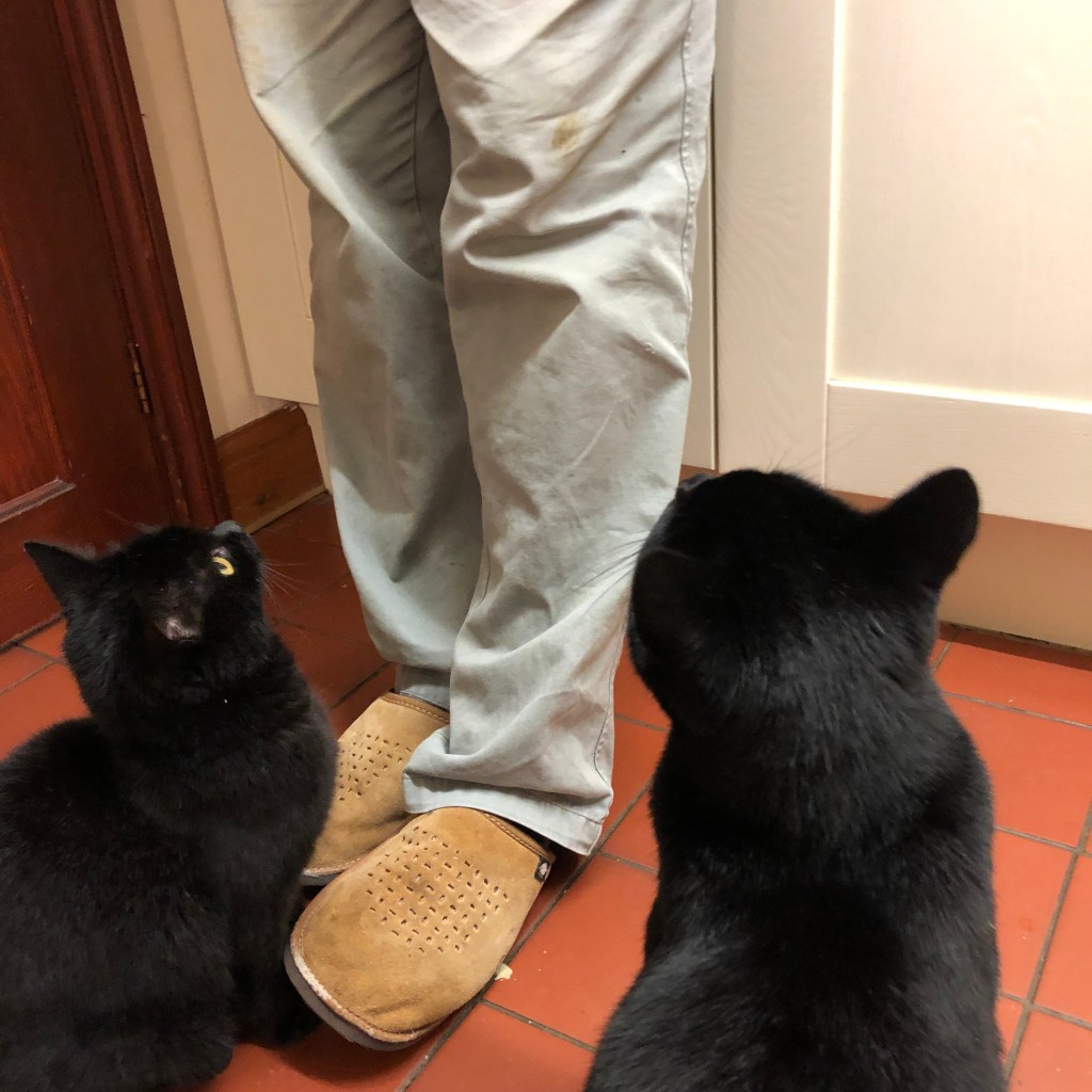 It’s dark, the fire is lit so it’s time for a whisky and crisps. The cats sit at Jeremy’s feet with an imploring look on their faces