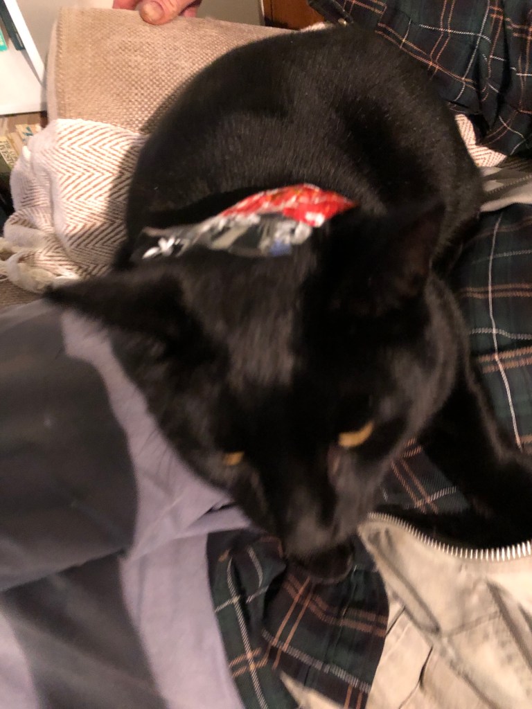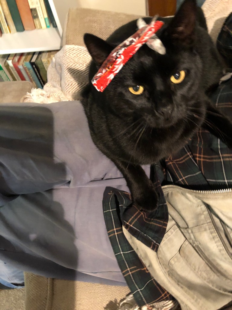 In return for sitting on Jeremy’s lap Nigel had to suffer the indignity of wearing some tinselly chocolate wrappers on his head. He didn’t seem to mind and we couldn’t help laughing