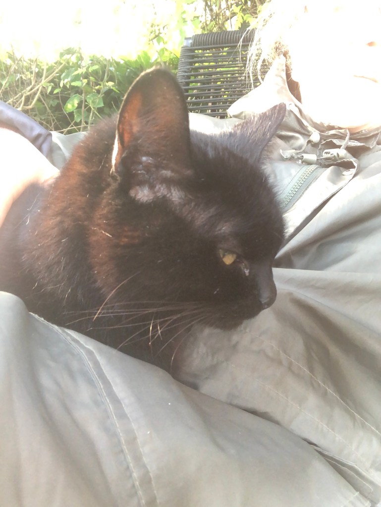 Mabel and I are sitting together under the pergola in warm sunshine.