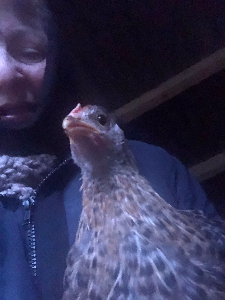 In the quail house the four teenage chicks eat from my hand every day. Sometimes I grab one (against its will) and give it a stroke and a cuddle. Today was the turn of the smallest bird