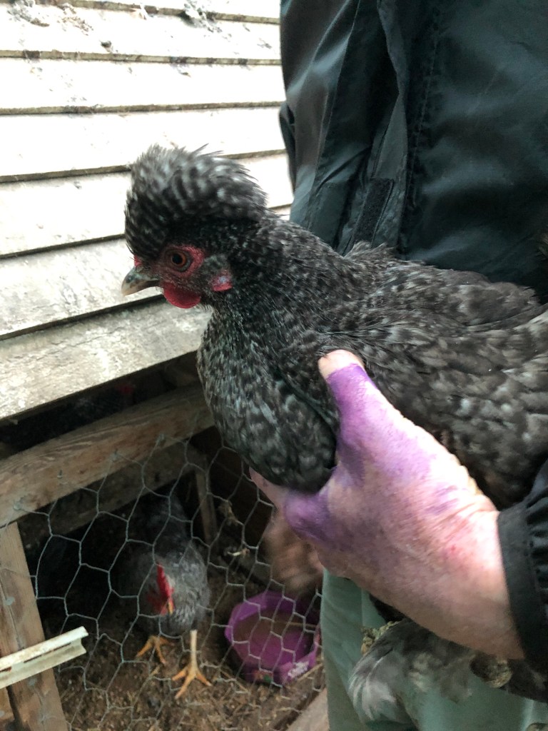 In the polytunnel Jeremy had a cuddle with one of the hens