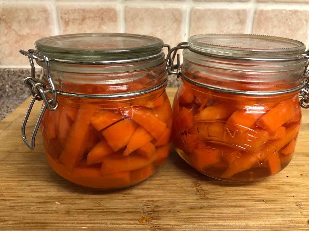 I had bought a “wonky” 1 kg bag of carrots from Sainsbury, Biggleswade, on the way home from London this afternoon – they only cost 30p. Inspired by daughter I found a recipe on the internet, filled two jars with the ingredients and will taste them tomorrow.