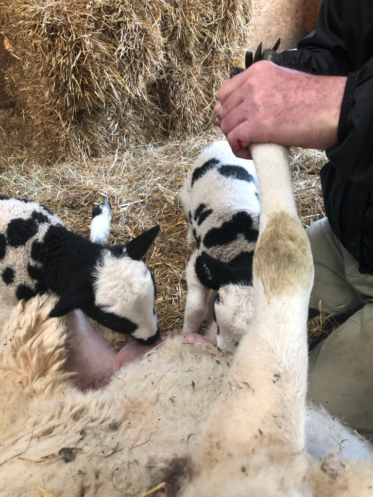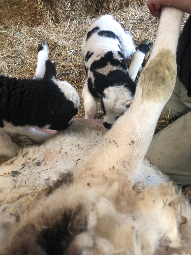 She has been limping around the field, twins trailing after her, for two days. We brought her into the barn last night with her lambs. This morning we upended her and Jeremy trimmed and sprayed her hooves. We will keep her in until Sunday