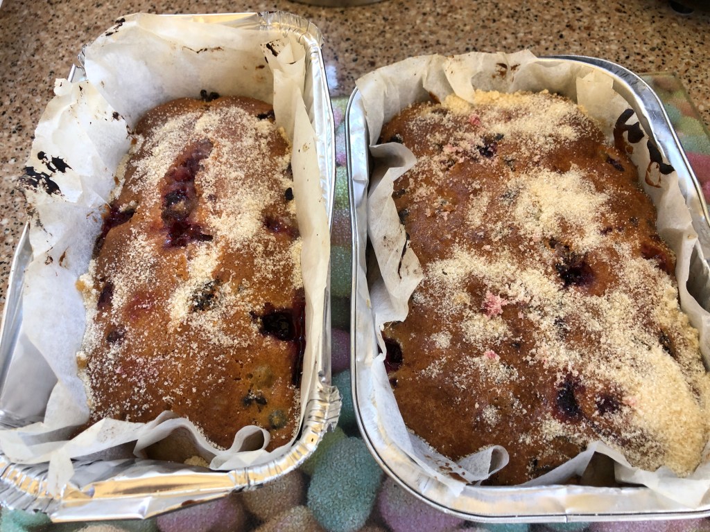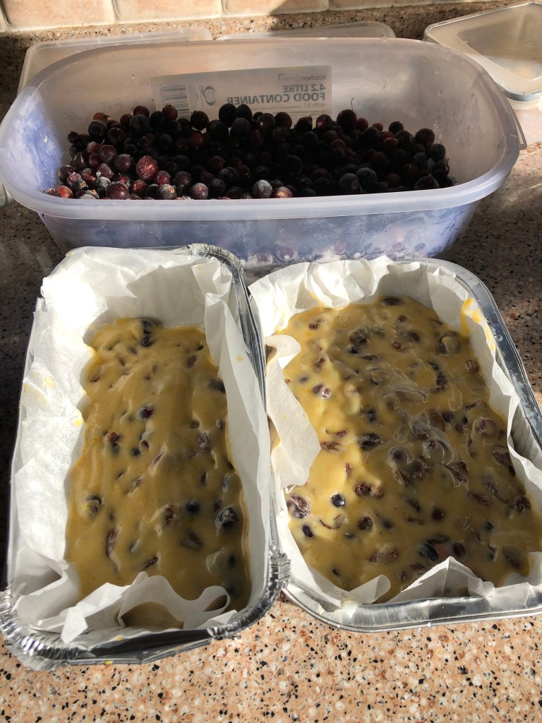 I think I mixed half a cup of sunflower oil with half a cup of golden caster sugar plus three eggs. Beat well then add a cup and a half of self raising flour, a cup of sultanas and a cup of blackcurrants. Bake at 160 until cooked and add some sugar on the top for the last five minutes of the baking