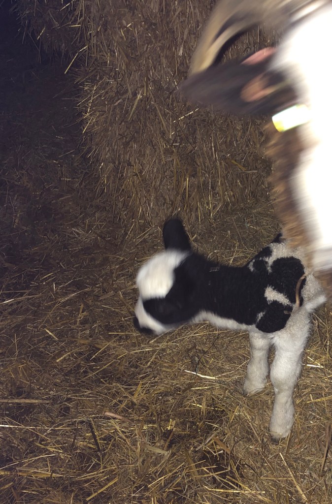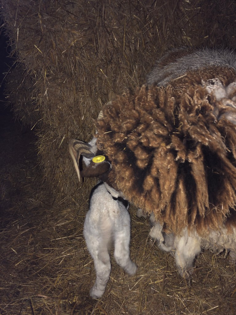 Spot and Susie, born last February to Pinky in difficult circumstances lived in the paddock with their sister, Surprise (who was unexpectedly born in August). As Spot and Susie are young we didn’t expect them to lamb this year. Hey ho! When we went to feed the sheep late this afternoon we found an EXTRA lamb in the paddock. Born to Susie – mother and lamb are now safely tucked up in a barn with water and straw and hay. I’m not convinced that the lamb is feeding but she looks well. I’ll take a view in the morning and get her started on a bottle if needs be.