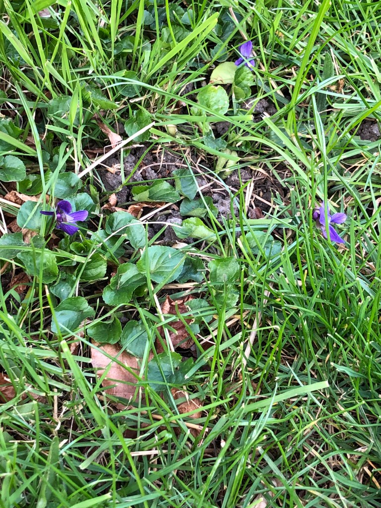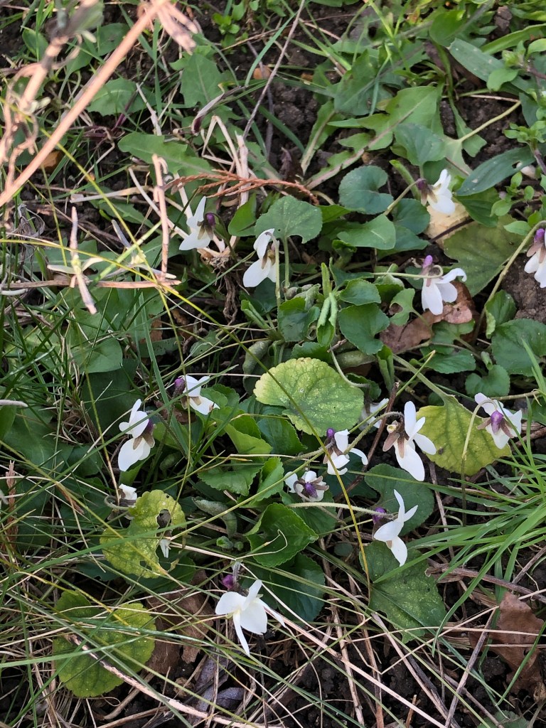 All over the ground their are tiny purple and white violets