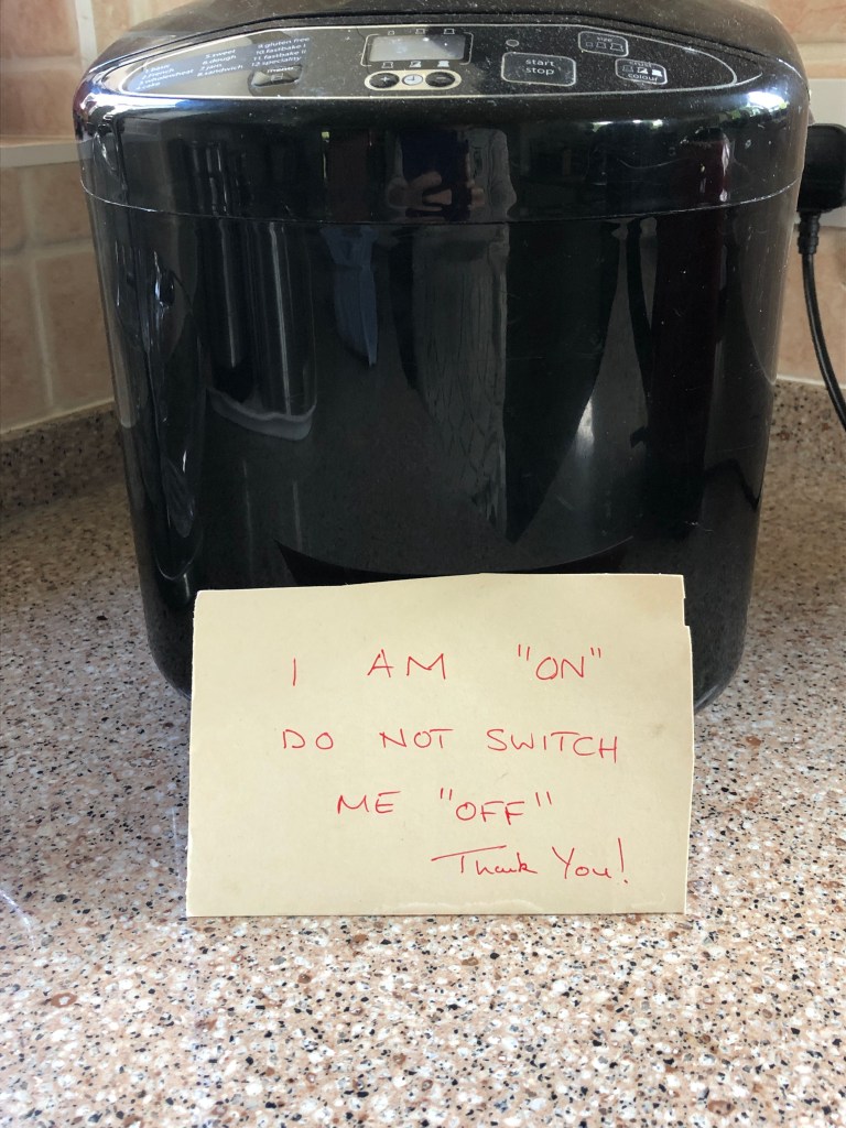 May 8, 2022 by gfreedman2013 This is the note I found when I entered the kitchen this morning J makes bread several times a week and sometimes I have, unintentionally, turned off the bread maker when I needed a socket for another machine. Ooops Share this: Click to share on X (Opens in new window) X Click to share on Facebook (Opens in new window) Facebook Like Loading... Related