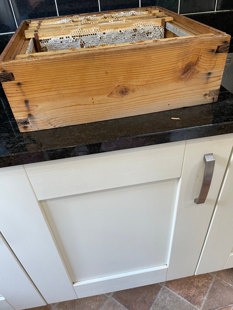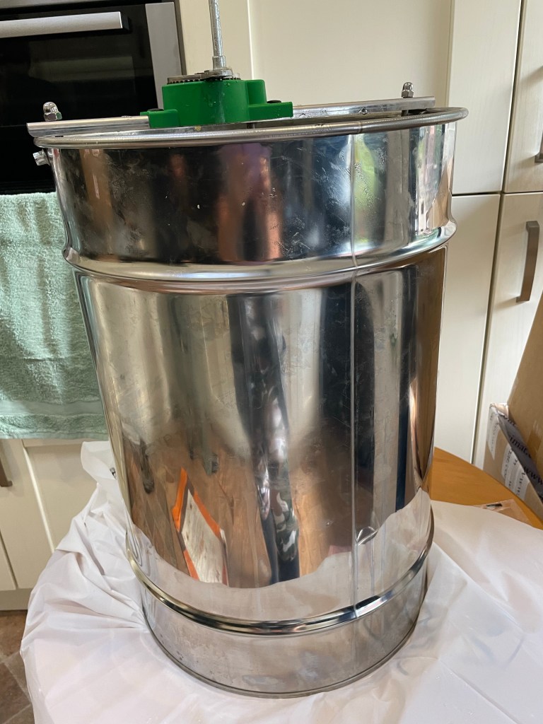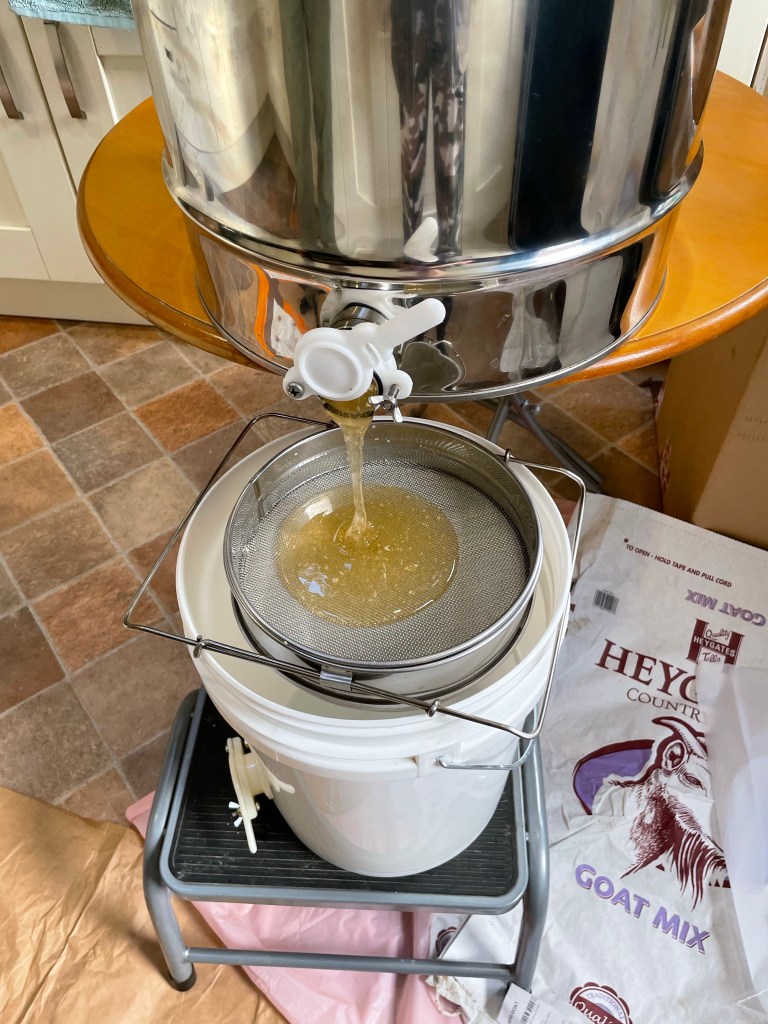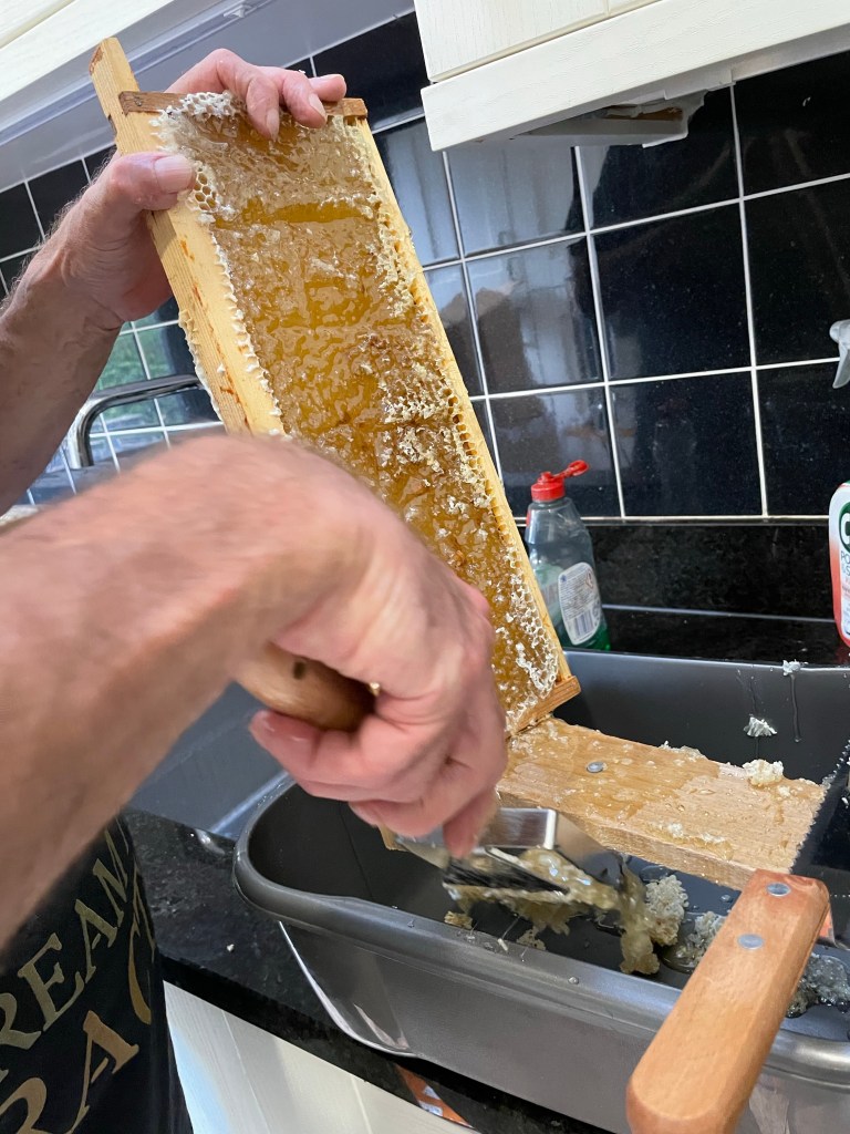 Once the frames were empty we placed the triple sieve below the spinner and opened the tap