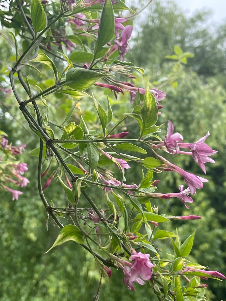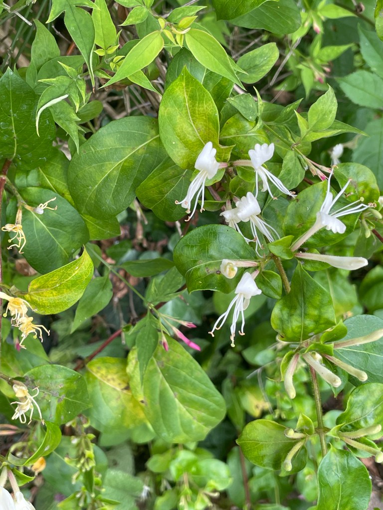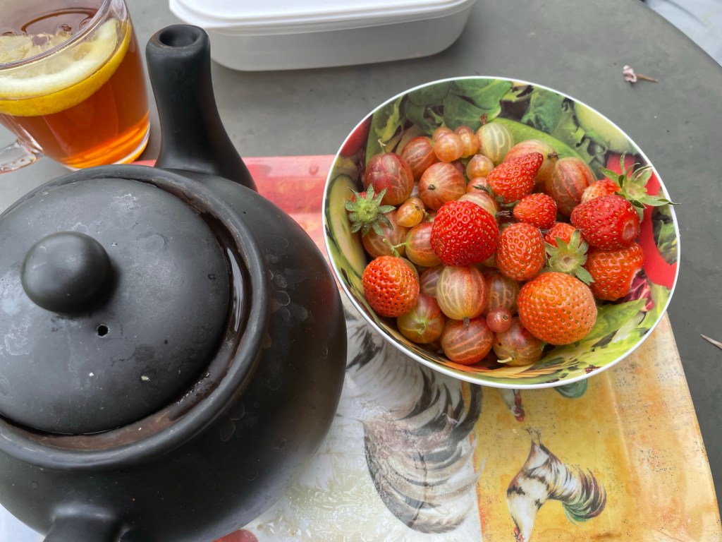 Gooseberries, strawberries and pink currants at afternoon tea time Under the pergola the fragrant jasmine and honeysuckle are both in bloom And they are humming with visiting bees