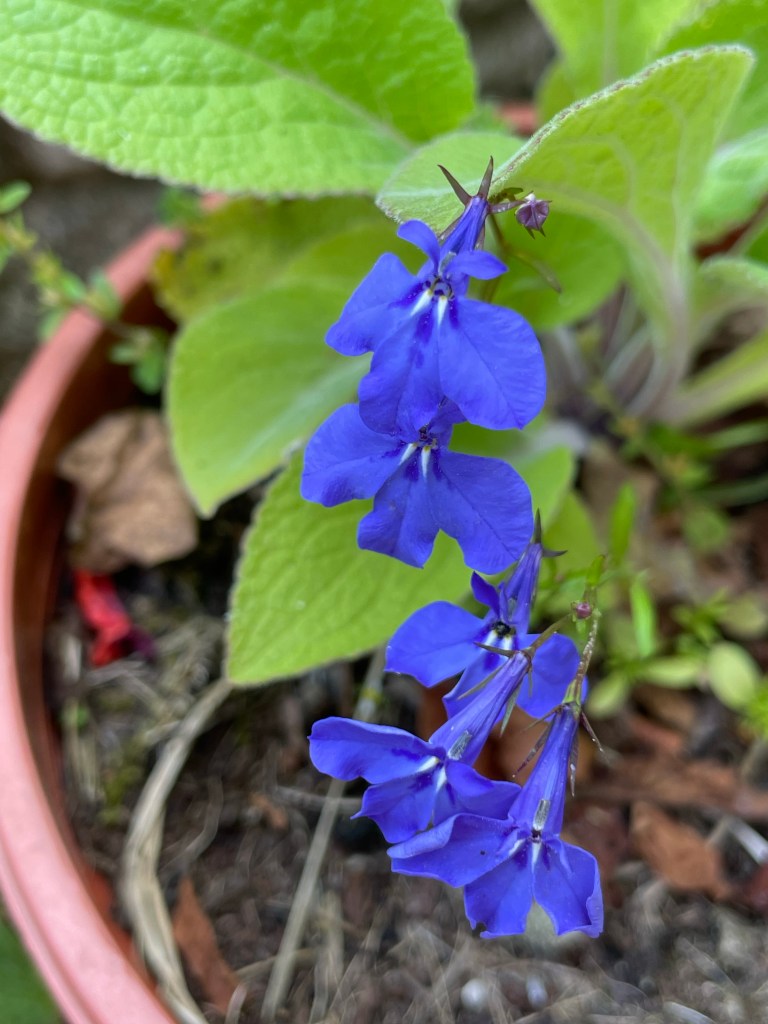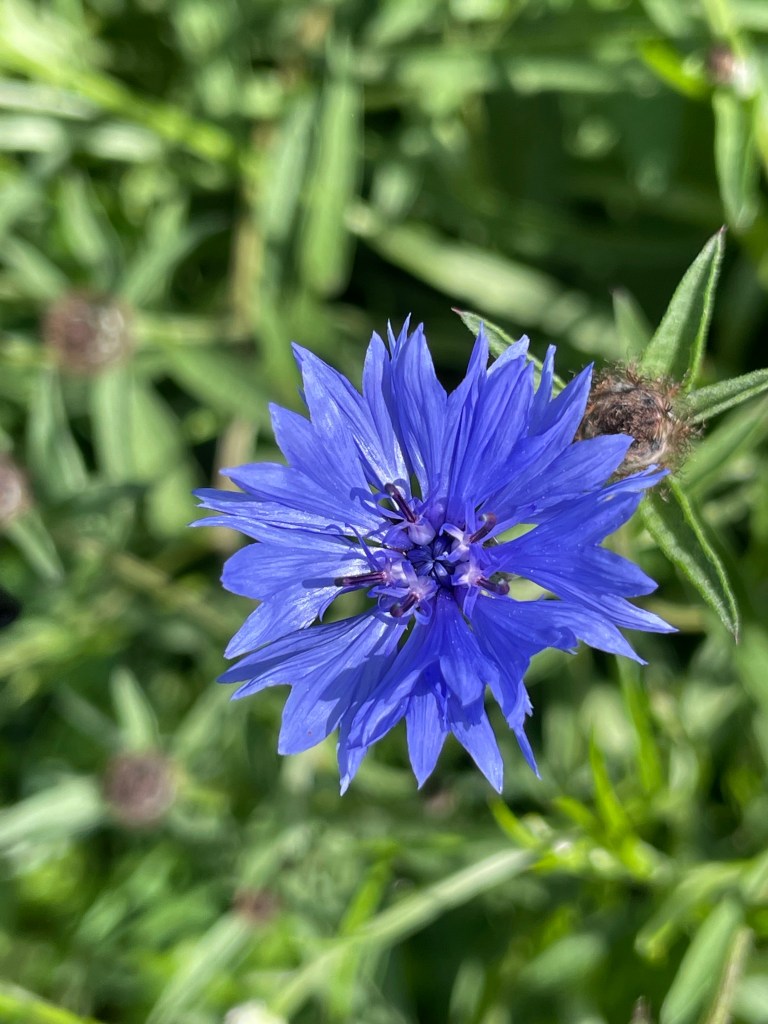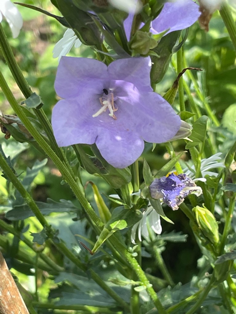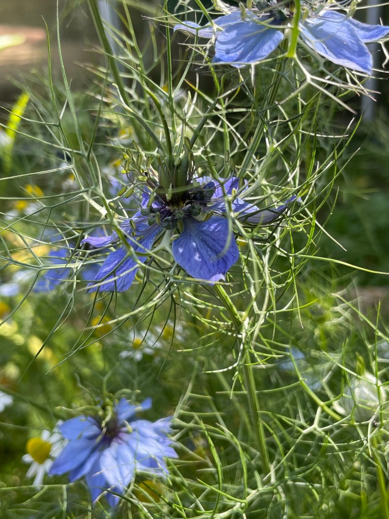 Cornflower blue in the gardenDeep blue lobelia in a pot in the pergola Tiny blue/ purple pansies growing in the cracks in the paving stones at the side of the housePale blue Nigella aka Love in a Mist – self seeded everywhereCampanula in a bed surrounded by oxeye daisies