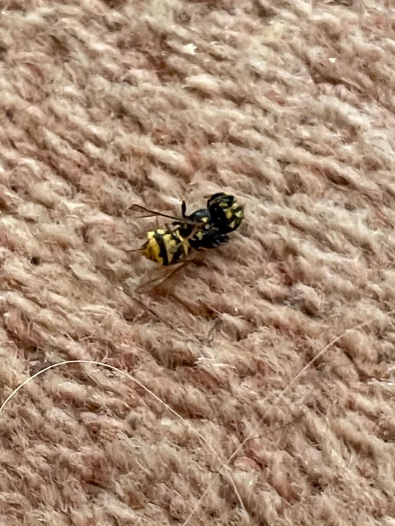 I called the roofer yesterday as a damp patch had appeared on the ceiling just above our bed. I thought it was a slipped tile on one of the roof gables (there are several gables here hence the name) snd he did a quick reccy and arranged to return on Thursday with his extra long ladder. At half past midnight i went upstairs to go to bed. The sight that met me was not pleasant. There were several wasps buzzing around and a wasp crawling out of the hole in the damp patch in the ceiling. Yikes! I called J and he grabbed his bee suit and a screwdriver and a can of insecticide that I keep downstairs. He battled the wasps, removed the honey comb in which they lay their eggs and pulled out hundreds of grubs
