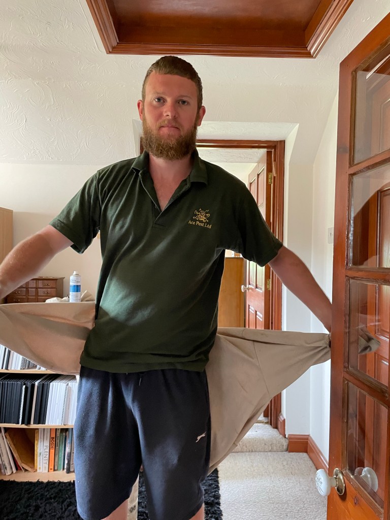 He cleared out the remaining few wasps snd spread a noxious powder into the cavity. Then he taped up the hole and, with a bit of luck, that’s the end of that particular wasp nest.
