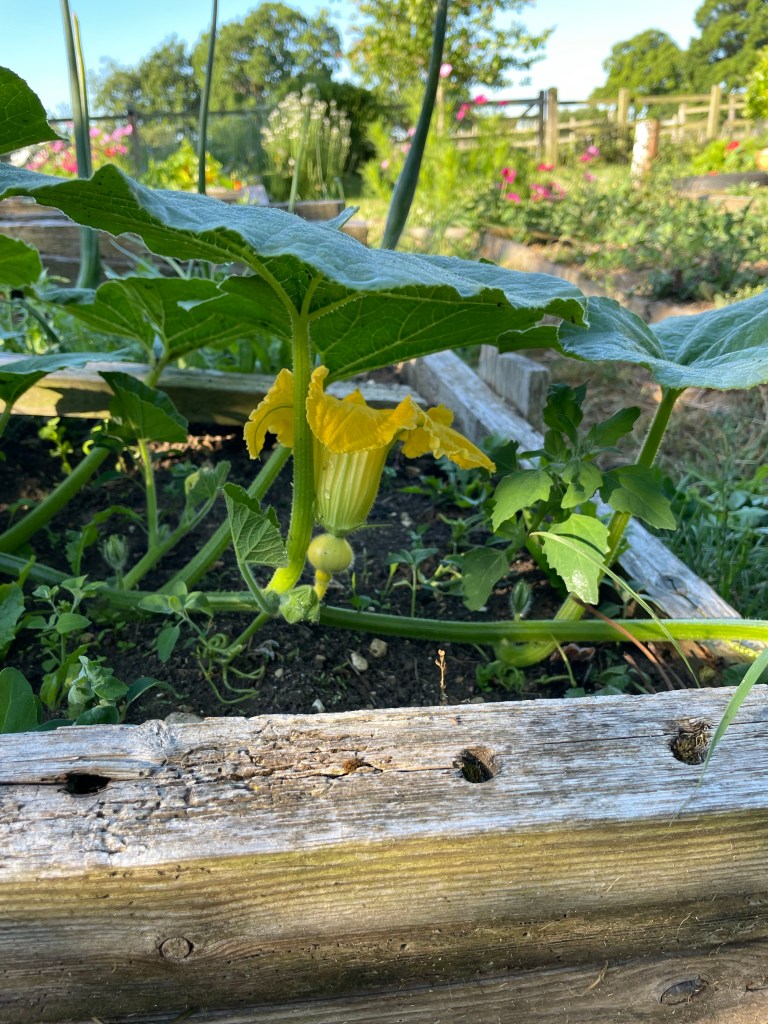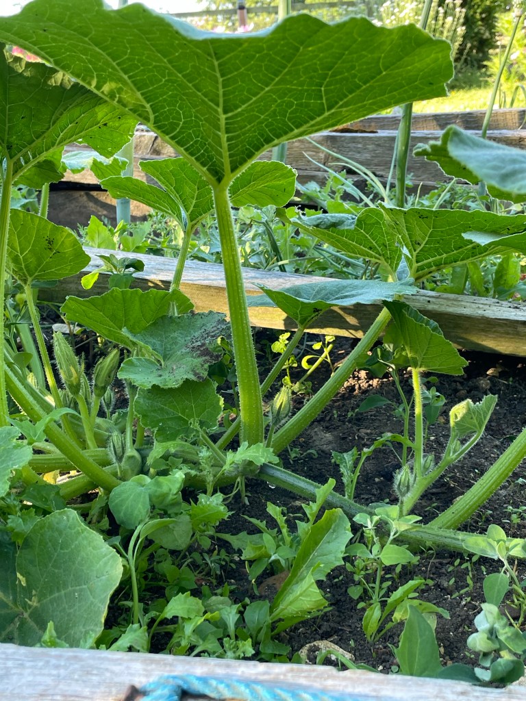 I saved some pumpkin seeds from two of our squashes that we grew last year. I sowed them in pots and put them on the kitchen windowsill and watered them lovingly. Only one seedling emerged – much to my disappointment. I planted it in a raised bed and kept a close eye on it, surrounding it with organic slug pellets whilst it was a vulnerable baby plant and then watering it when the days were dry. This morning I admired it.