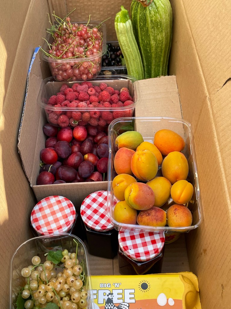 July 13, 2022 by gfreedman2013 Before the family left we went fruit picking in the garden We put it all in a box with eggs and jam and honey Share this: Share on X (Opens in new window) X Share on Facebook (Opens in new window) Facebook Like Loading... Related