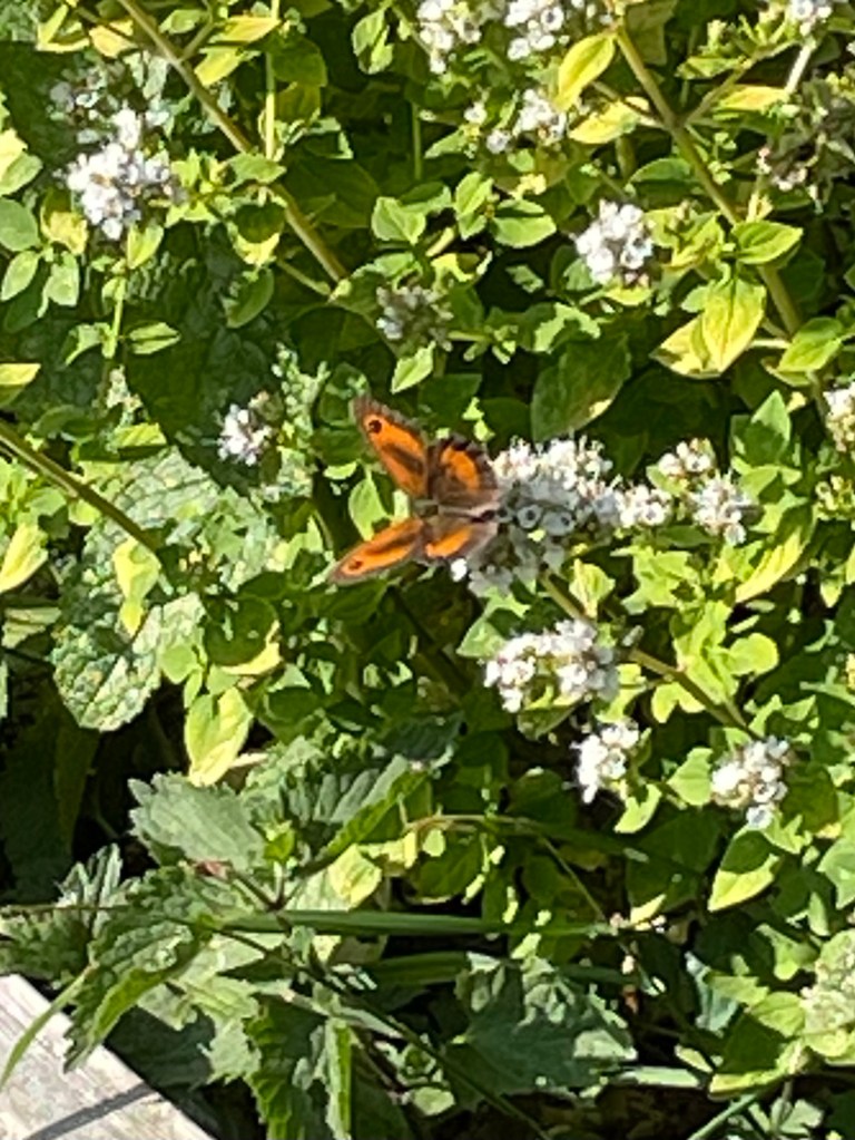 1. Sorry wrong ID on your brown butterfly. This is the Gatekeeperwhich is slightly smaller, more flitting in its flight and doesn’t settle so readily. It has more orange on its wings and only emerges in mid July. I saw several this morning as well – one of my favourites.