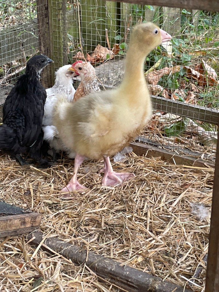 Knocked on our door to ask if we had any spare goose eggs. They live in a neighbouring village and had seen our small flock of geese and wanted goose eggs for their incubator. We gave them six and promptly forgot about them. This afternoon the lovely man arrived holding a box and a solitary gosling- the only one that hatched. He wouldn’t keep a goose on its own and decided the baby should come back to The Gables.