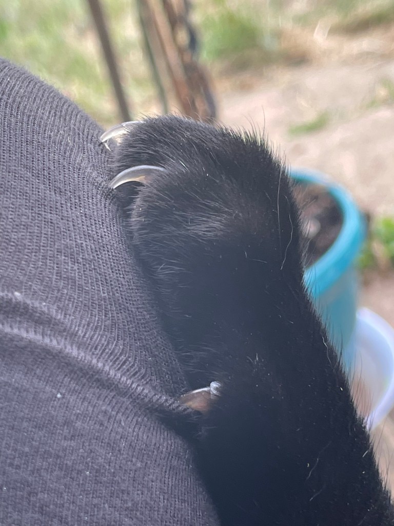 July 24, 2022 by gfreedman2013 A dangerous creature on my lap And look at these claws digging into my leg through the thin cotton Ouch! I might be Nigel’s prey Share this: Share on X (Opens in new window) X Share on Facebook (Opens in new window) Facebook Like Loading... Related