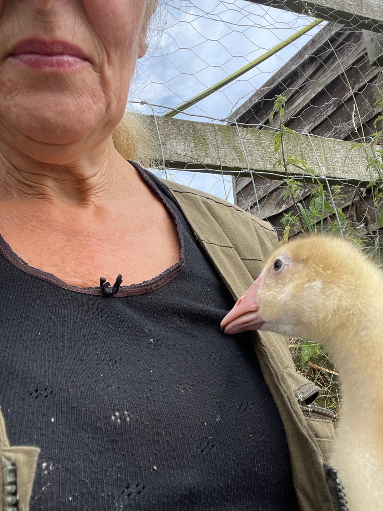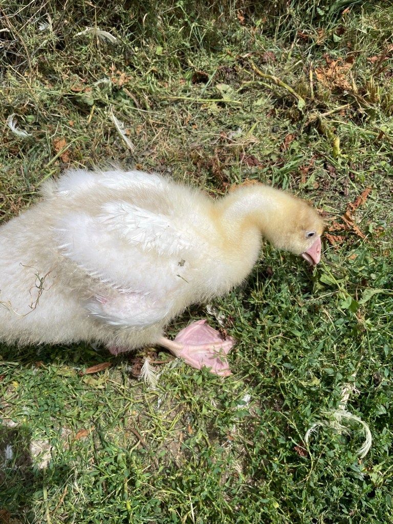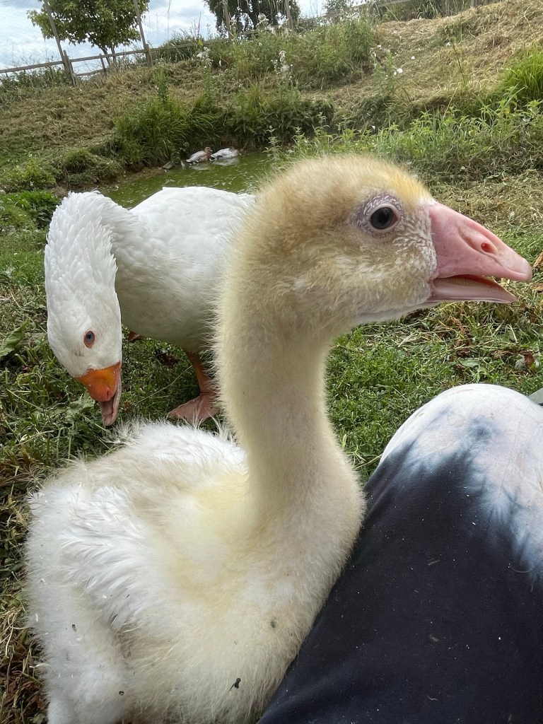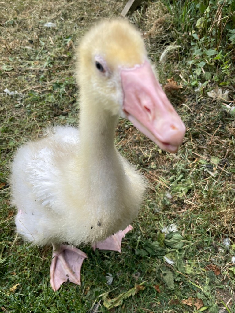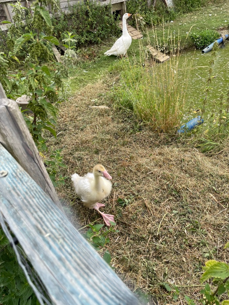 We moved baby gosling to the duck pond, just now, to live with Luca (aka Lucy) and two ducks. For the last few weeks she has lived with chicks snd believed herself to be a chicken. She is very frightened but she is outgrowing the chicks and the chick run and she also needs access to grass in which to graze