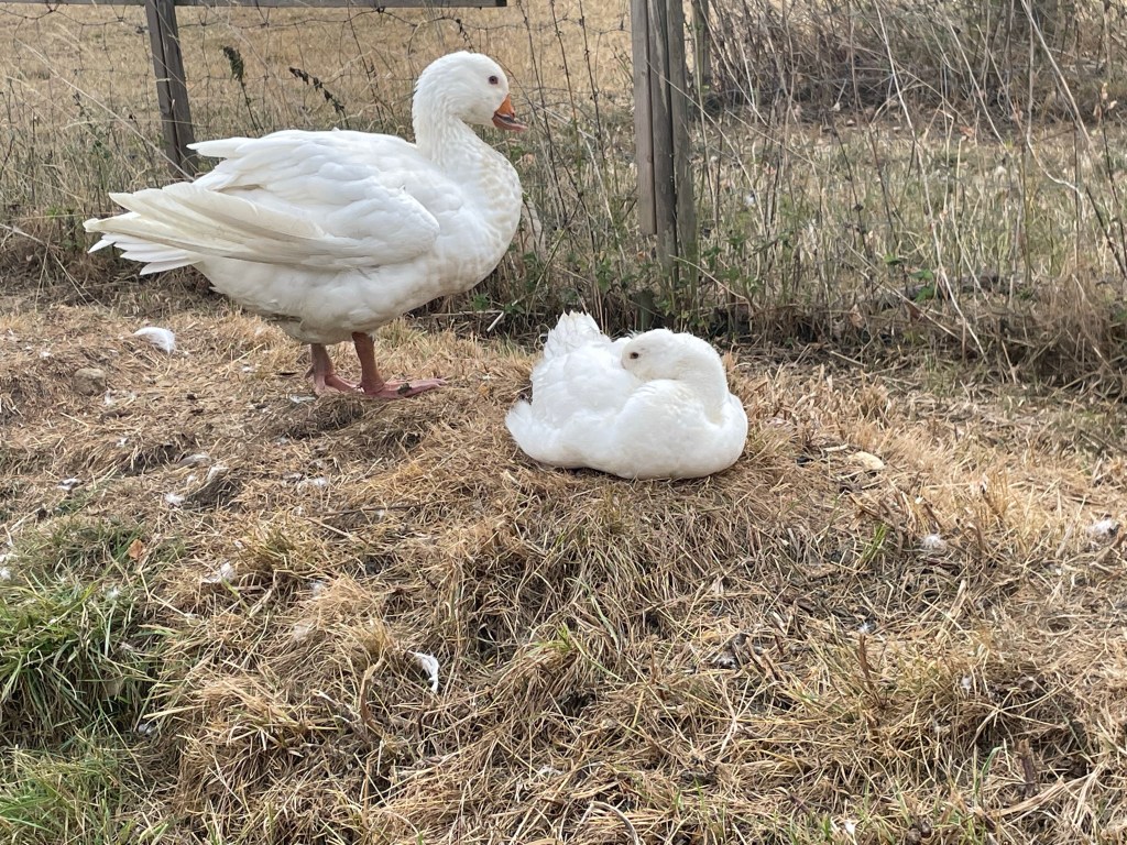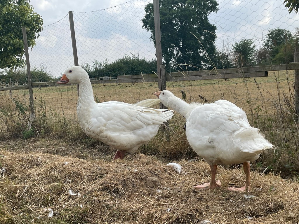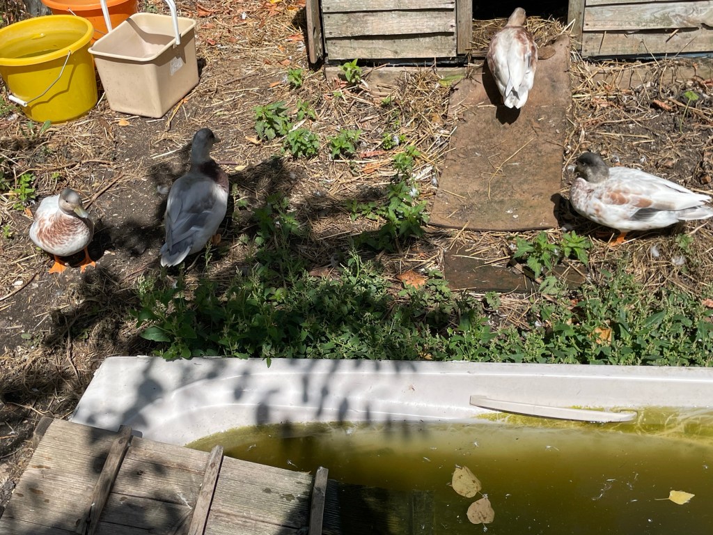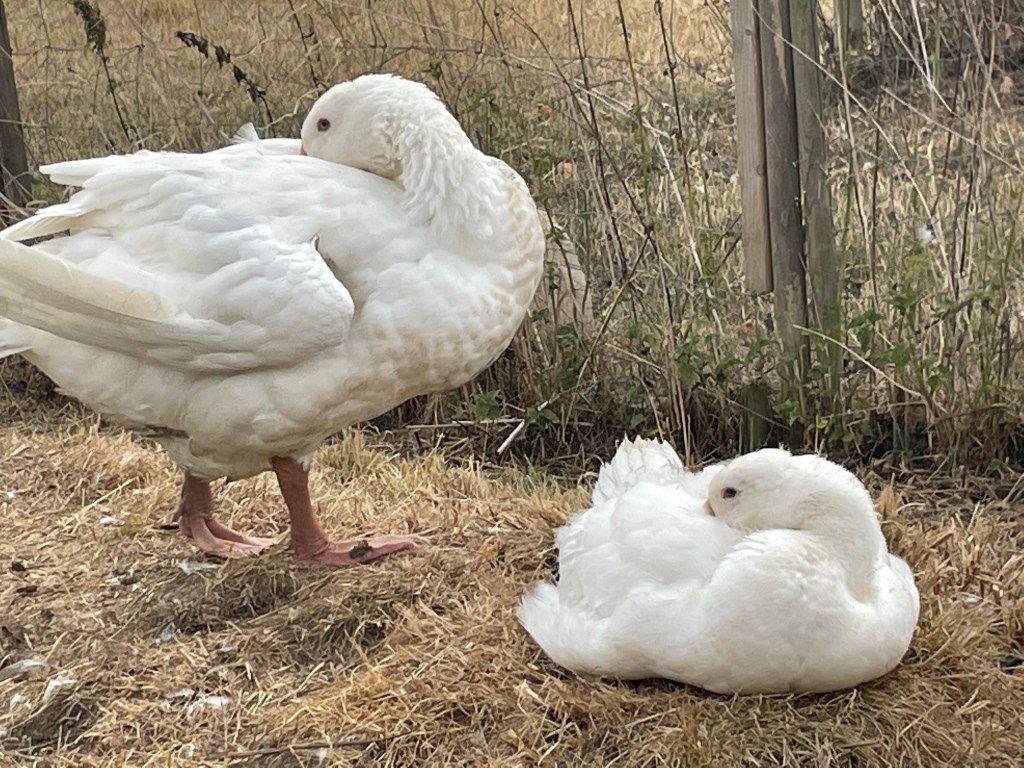 Strangely grandson and I found the two ducks (who had previously lived with the goose and gosling) outside the other duck run yesterday afternoon. They must have flown across the garden to pay a visit. So now all four ducks are together near the house and the goose and gosling have the pond to themselves.