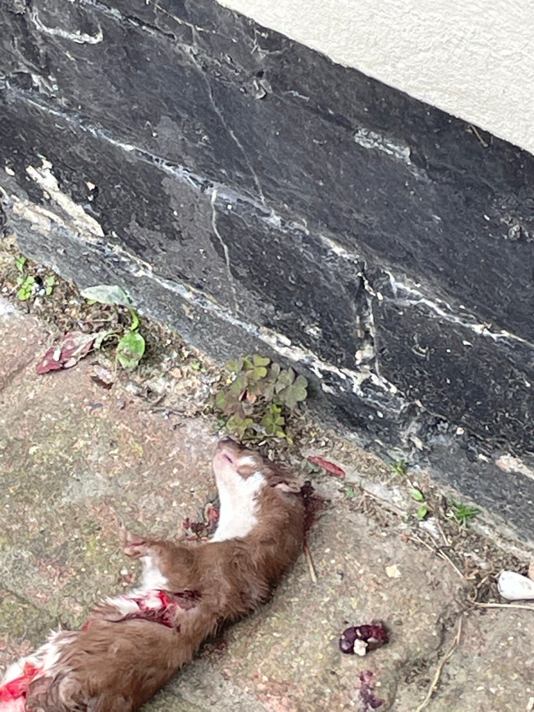 I stayed in bed this morning whilst Jeremy fed and watered the animals. Just outside the kitchen door he found Nigel with his latest prey
