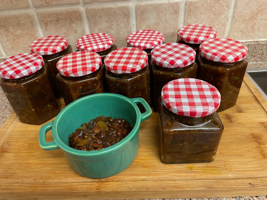 October 8, 2022 by gfreedman2013 Prepared on Friday, cooked this evening Ten jars of green tomato chutney Share this: Share on X (Opens in new window) X Share on Facebook (Opens in new window) Facebook Like Loading... Related