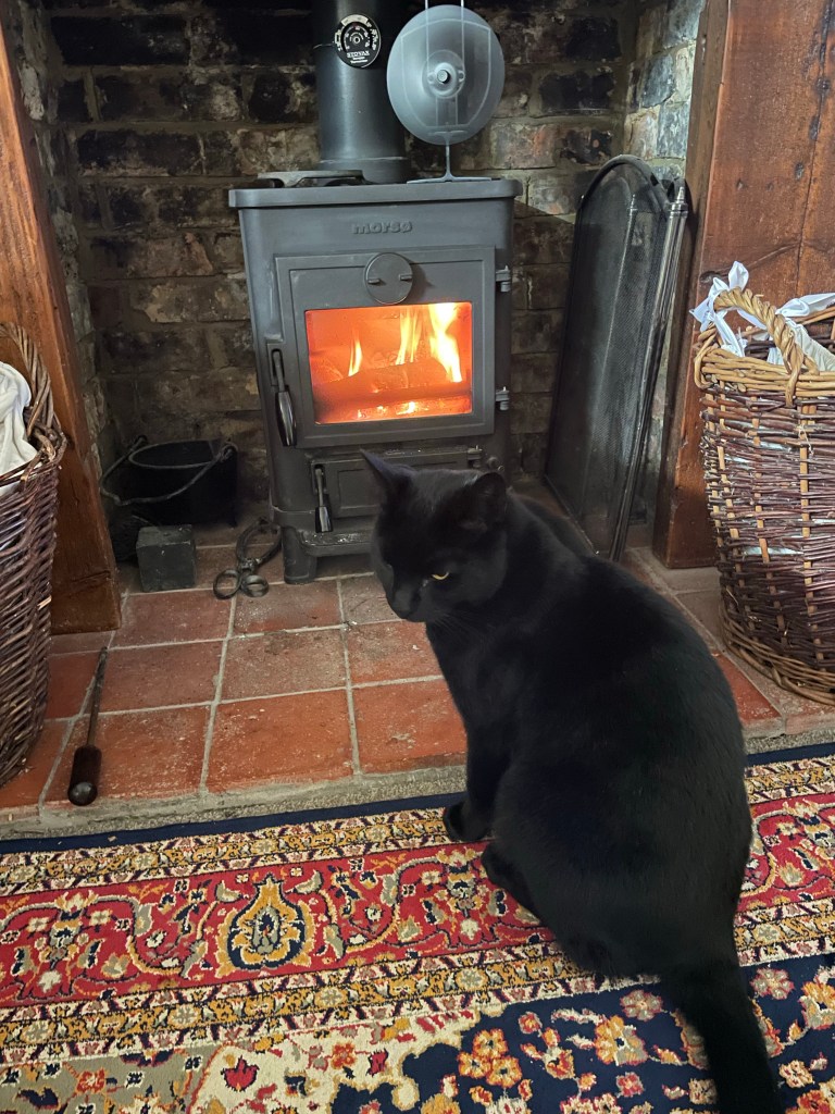 I put Jeremy’s freshly baked loaf of bread on the dining room table to cool. Usually I shut the door to the living room/dining room to stop the cats being tempted by the warm bread. Tonight, Nigel came into the kitchen to sit by the fire. We were about to eat our supper so I put Nigel outside in the hall whilst we ate in peace. But…….I had left the living room door ajar……