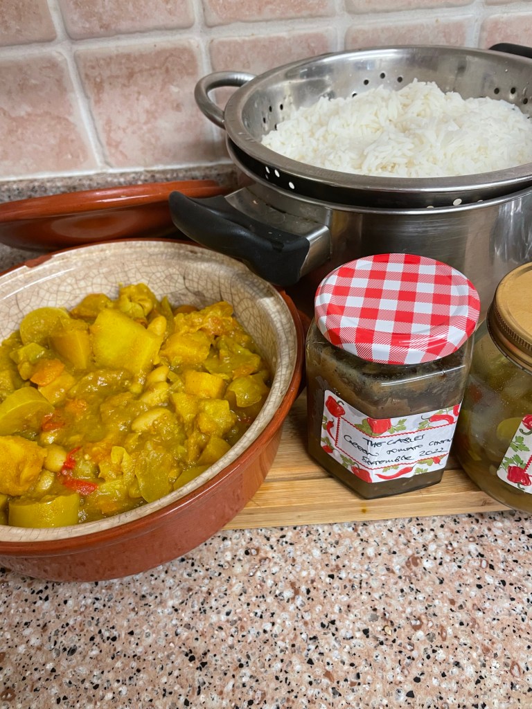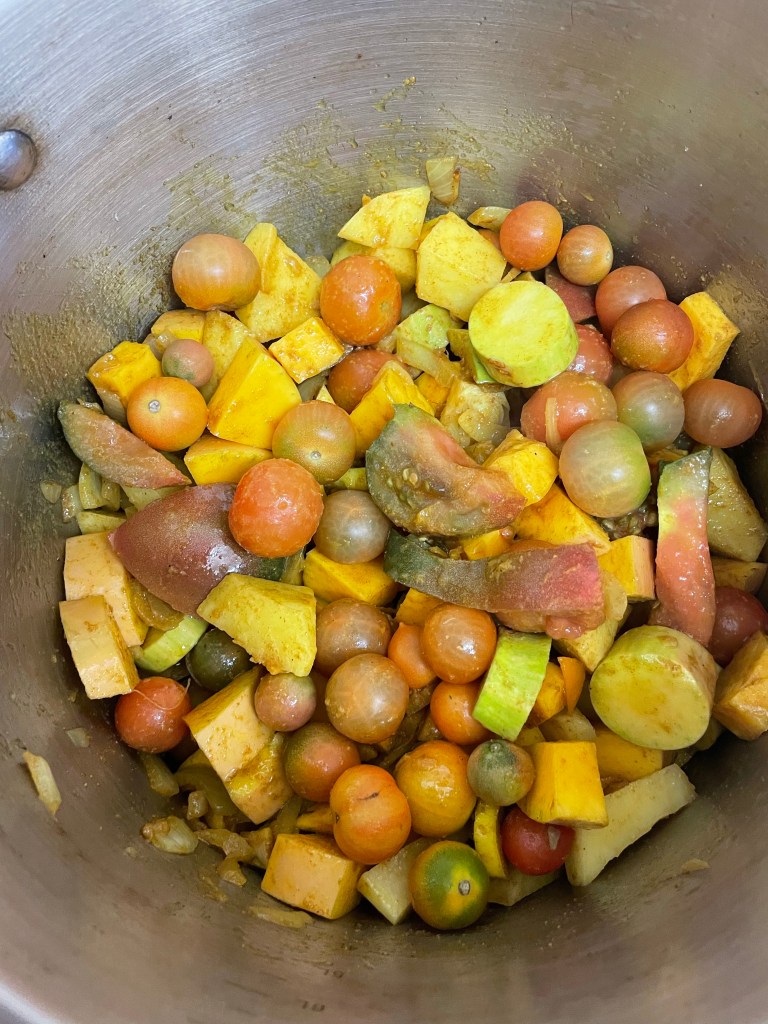 Using half a butternut squash and a small tromboncino, three assorted chilli peppers, a couple of onions, a good helping of tomatoes and some diced potatoes plus cumin and turmeric and Jerusalem spice