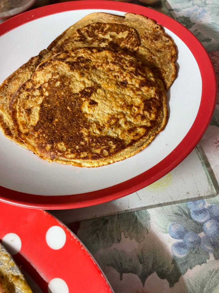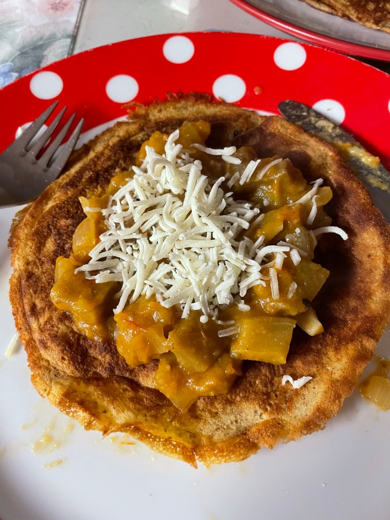 These pancakes are made with starter surplus. The topping is tomato and onion and aubergine and cheese. The aubergines are still growing in the poly tunnel