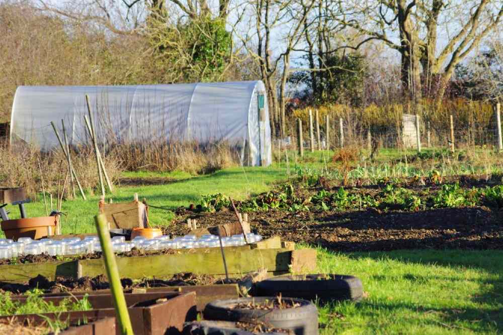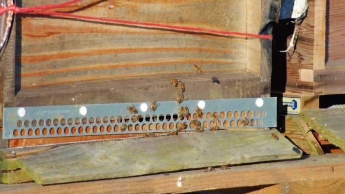 The bees, below, have been moved to a new site away from the vegetable garden. J says the bees come out for “cleaning flights” during the winter. The metal strip over the opening is a mouse guard to prevent rodents entering the warm hive during the cold months The garden in winter