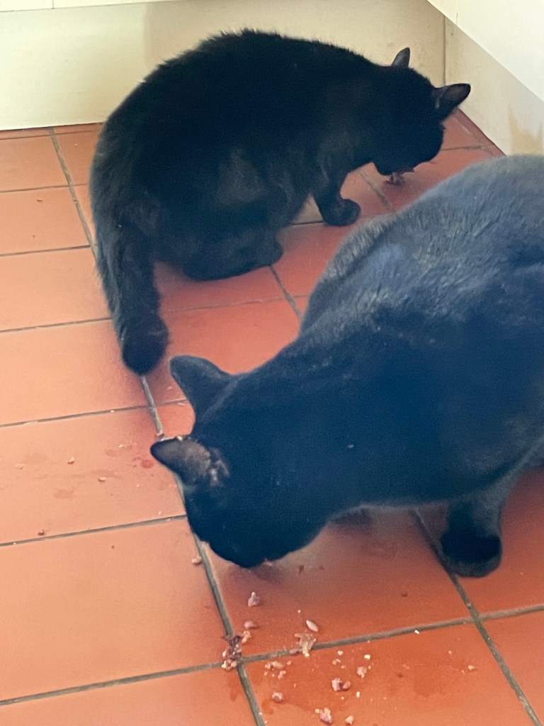 Nigel had opened the compost bin on the counter and found some left over cabbage in a cheese and peanut sauce. He decided to share it with Mabel. Click below