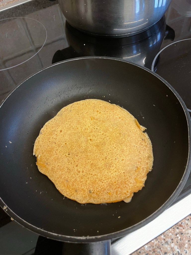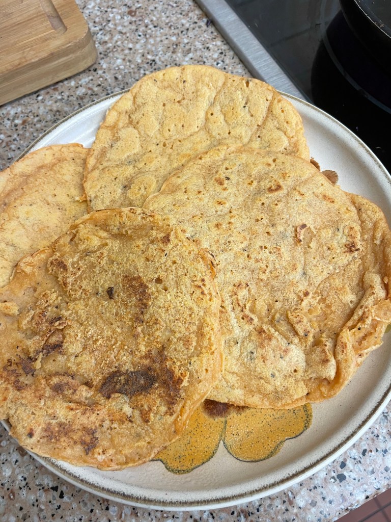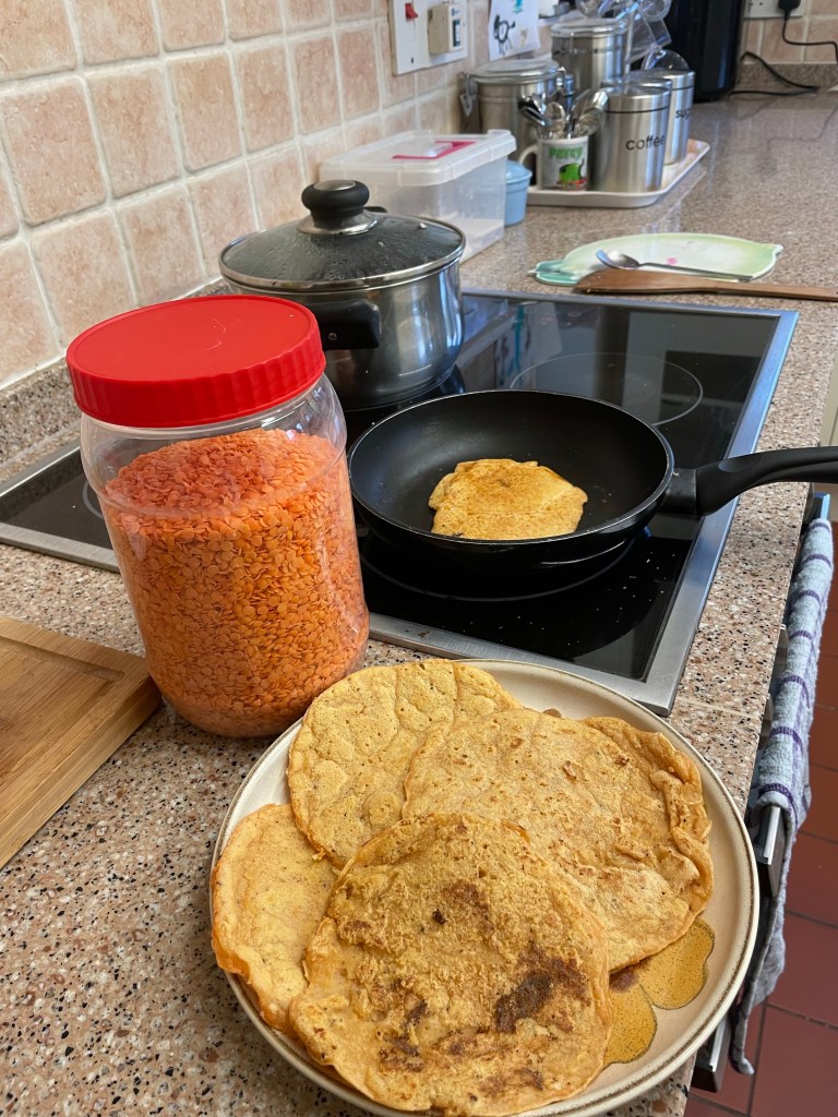 Just half a cup of red lentils soaked in one cup of water. Leave overnight or at least three plus hours. I then changed the water but some recipes don’t. I used a stick blender to make a thick batter. Heated a non stick pan – hot! No oil. Poured in a spoonful and swirled in the pan to make a circle. Cook on one side using a spatula to loosen the edges and then flip and cook on the other side. Truly delicious and ridiculously simple. My kind of recipe.